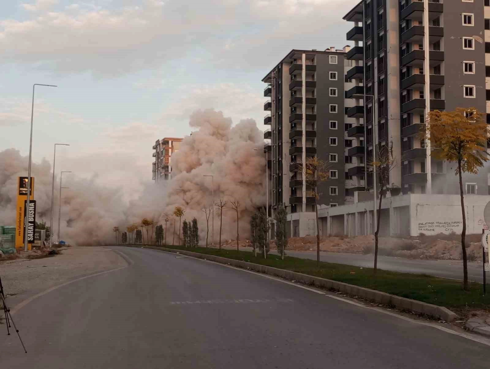 Malatya'da Kahramanmaraş merkezli depremler öncesi raylı sistem özelliği bulunduğu belirtilerek satışa sunulan ağır hasarlı bina, patlayıcı ile saniyeler içerisinde yıkıldı.
