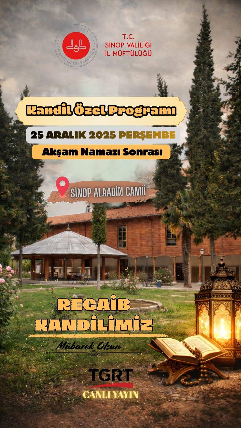 Sinop’ta Regaib Kandili özel programı, TGRT EU, TGRT Haber ve TGRT Belgesel kanallarından eş zamanlı olarak canlı yayınlanacak. T.C. Sinop Valiliği İl Müftülüğü koordinasyonunda hazırlanan program, 25 Aralık Perşembe günü akşam namazının ardından Sinop Alaaddin Camii’nde gerçekleştirilecek.