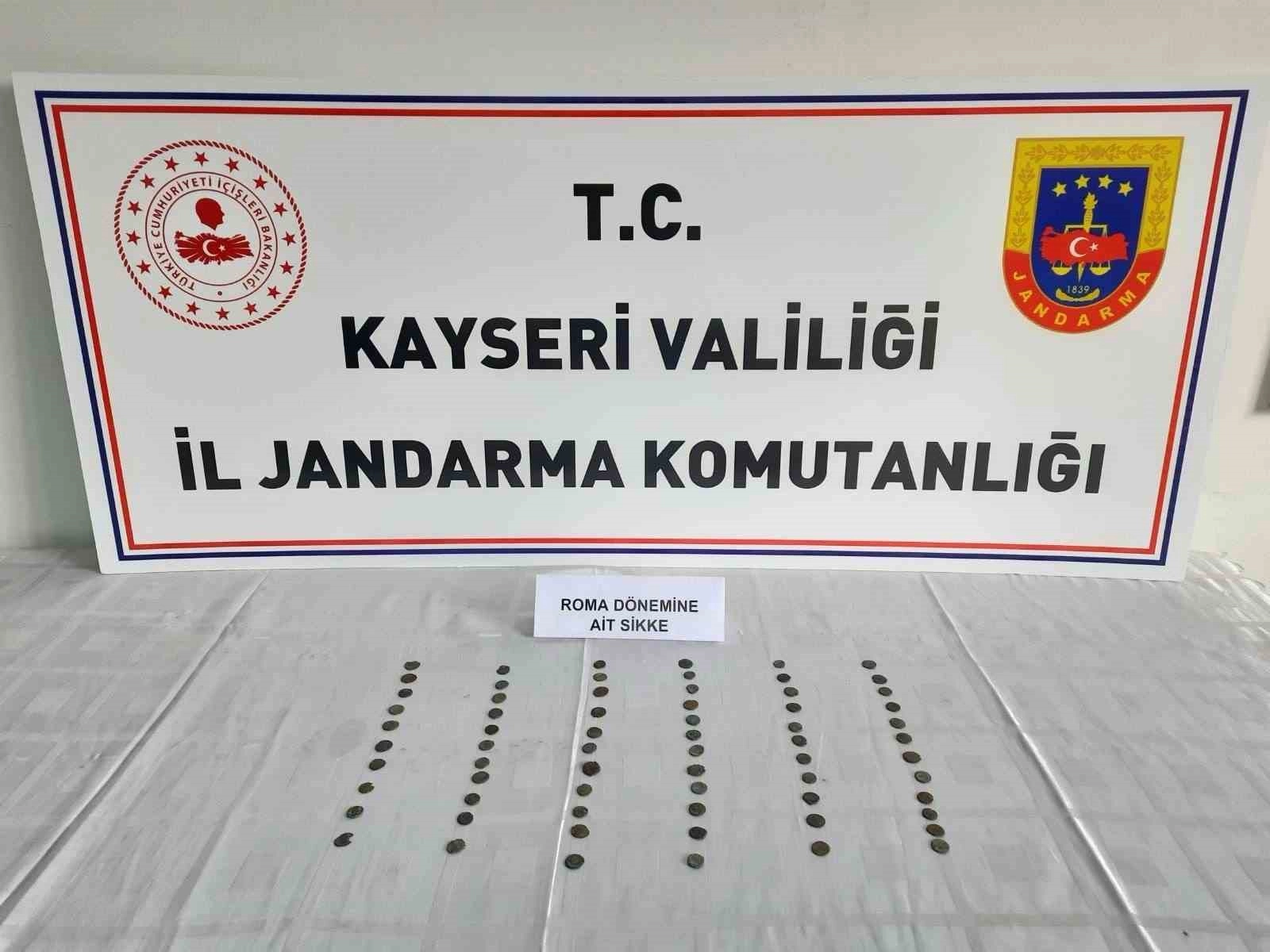 Kayseri İl Jandarma Komutanlığı ekiplerince yapılan çalışmalarda roma ve Bizans dönemlerine ait olduğu değerlendirilen 67 adet sikke ele geçirilirken 1 kişi gözaltına alındı.
