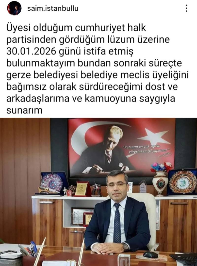 Açıklamasında kararını kamuoyuna saygıyla sunduğunu ifade eden İstanbullu, “Üyesi olduğum Cumhuriyet Halk Partisi’nden gördüğüm lüzum üzerine 30.01.2026 günü istifa etmiş bulunmaktayım. Görevimi bağımsız olarak sürdüreceğim” ifadelerini kullandı.