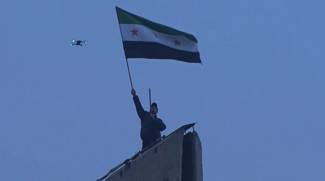 Suriye'nin başkenti Şam'da halk, Esad rejiminin devrilmesini şehrin sembollerinden olan 40 metre yüksekliğindeki Şam Kılıcı Abidesi'nde yeni Suriye bayrağı ile kutladı.