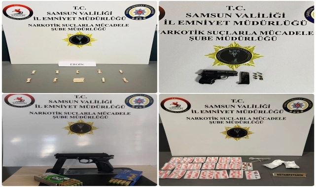 Kent genelinde belirlenen adreslere düzenlenen operasyonda 22,76 gram eroin, 451 sentetik ecza hapı, 81,86 gram sentetik uyuşturucu, 14,59 gram esrar, uyuşturucu kullanma aparatı, 2 ruhsatsız tabanca ve 80 tabanca fişeği ele geçirildi.