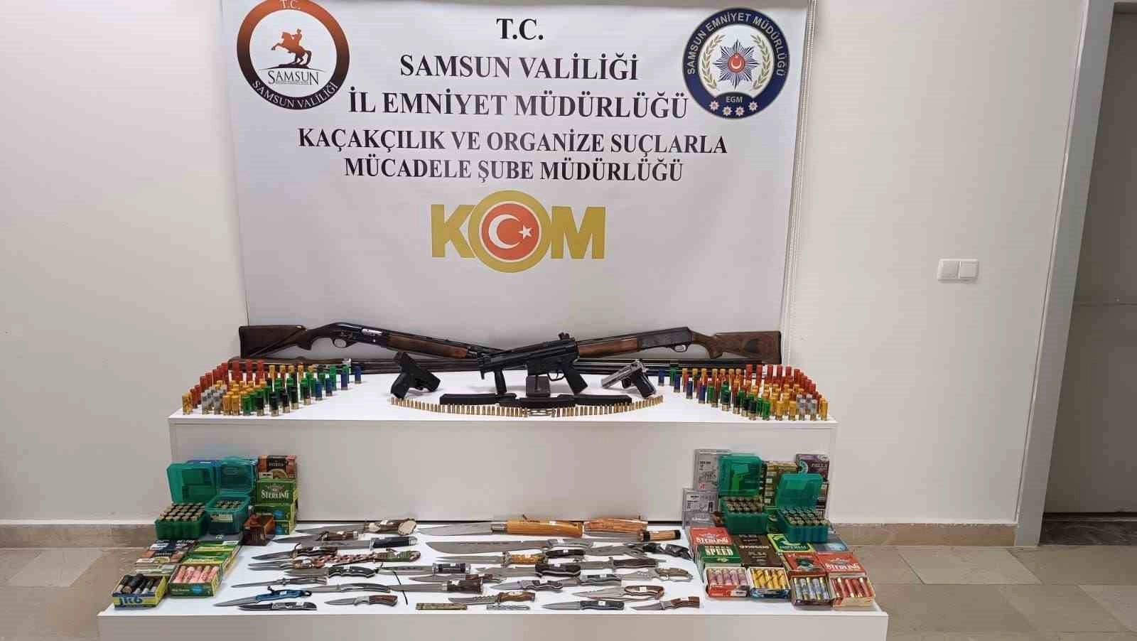 Edinilen bilgiye göre, Samsun İl Emniyet Müdürlüğü Kaçakçılık ve Organize Suçlarla Mücadele (KOM) Şube Müdürlüğü ekipleri, silah ve mühimmat kaçakçılığına yönelik yürüttükleri çalışmalar kapsamında Atakum ilçesinde bir eve operasyon düzenledi. Yapılan aramalarda, 3 adet ruhsatsız av tüfeği, 32 adet 6136 sayılı kanun kapsamında olan sivri uçlu, oluklu bıçak ve kama, 3 adet kurusıkı tabanca, 1 adet muşta, 59 adet tabanca fişeği, 8 adet kurusıkı tabanca fişeği ve 971 adet tüfek fişeği bulundu. Operasyon kapsamında Z.G. (46) yakalanarak gözaltına alındı. Soruşturma devam ediyor.