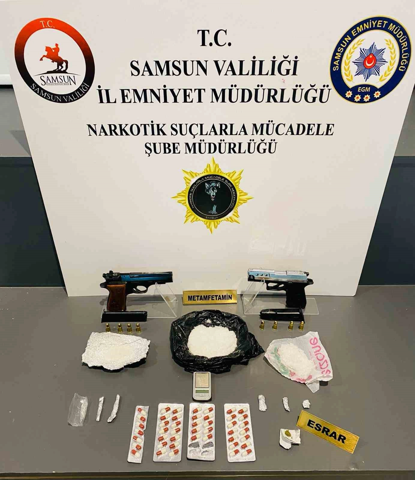 Edinilen bilgiye göre, Samsun Cumhuriyet Başsavcılığı koordinesinde Samsun Emniyet Müdürlüğü Narkotik Suçlarla Mücadele Şube Müdürlüğü ekipleri narkotik uygulaması düzenledi. İlçe emniyet müdürlükleri ve şube müdürlüğü ekiplerinin de desteğiyle yapılan aramalarda 313 adet sentetik ecza, 129.99 gram metamfetamin, 51 adet extacy hap, 2 adet ruhsatsız tabanca, 1 adet ruhsatsız tüfek, 6,9 gram esrar, 1 fişek esrarlı sigara, 2 adet hassas terazi, 1 adet uyuşturucu madde kullanım aparatı ve 8 adet tabanca fişeği ele geçirildi. Hırsızlık, silahla tehdit ve hükümlünün kaçması suçlarından 13 yıl 8 ay 23 gün kesinleşmiş hapis cezası bulunan 1 kişi, uyuşturucu suçundan 10 yıl 1 ay kesinleşmiş hapis cezası bulunan 1 kişi, 6136 SKM ve trafik güvenliğini tehlikeye sokma suçundan 5 ay kesinleşmiş hapis cezası bulunan 1 kişi ile uyuşturucu suçundan ifadeye yönelik aranan 1 kişinin de aralarında bulunduğu toplam 28 kişi yakalandı.