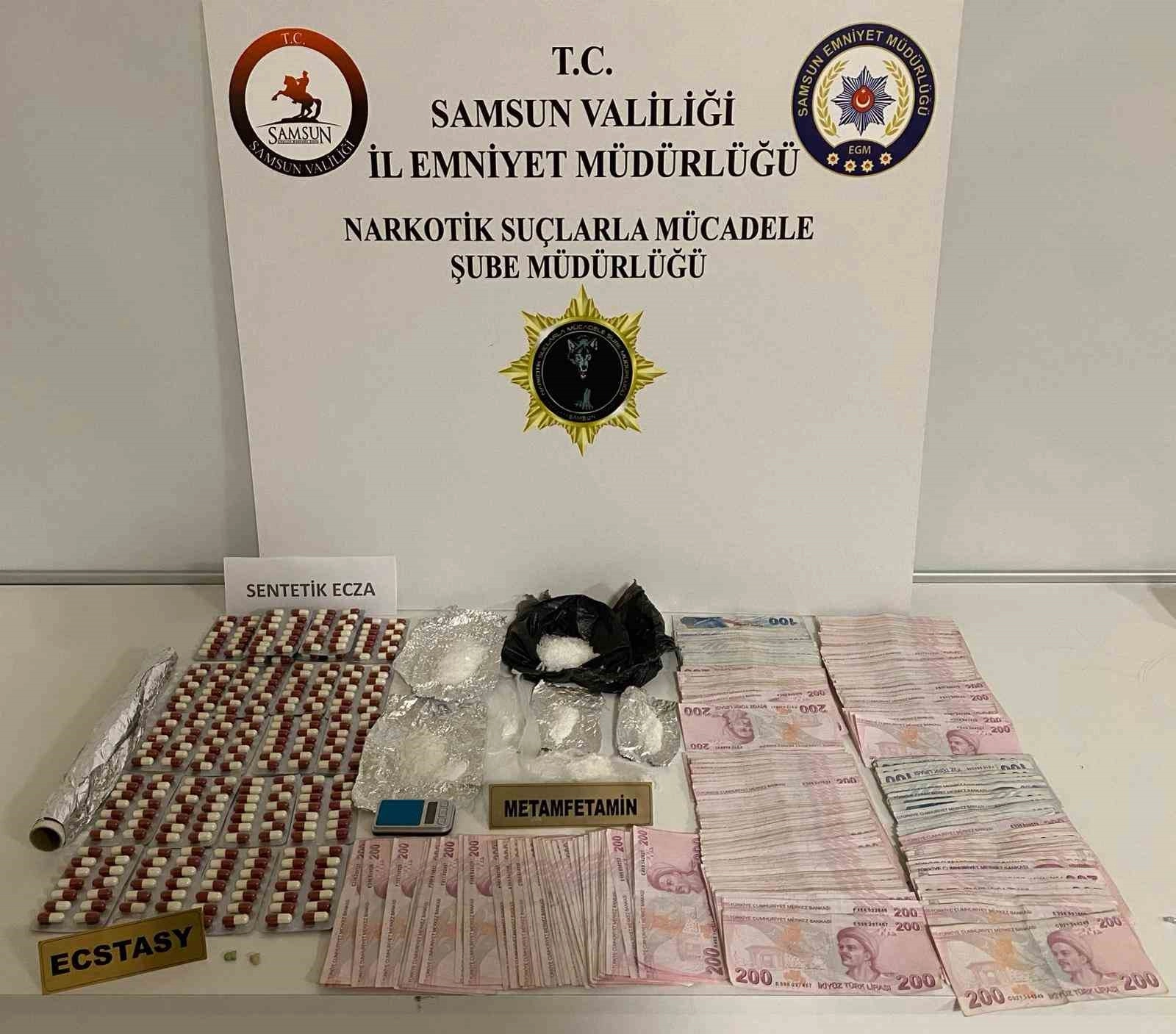 Edinilen bilgiye göre, Samsun Emniyet Müdürlüğü Narkotik Suçlarla Mücadele Şube Müdürlüğü ekipleri, düzenlenen narkotik uygulamasında, 526 adet sentetik ecza, 226 gram skunk, 180, 24 gram esrar, 83,8 gram metamfetamin, 3 adet hassas terazi, 4 adet uyuşturucu madde kullanım aparatı, 2 adet extacy hap, 1 adet esrarlı sigara ve uyuşturucu madde ticaretinden elde edildiği değerlendirilen 72 bin 700 TL ele geçirildi. Kasten adam öldürmeye teşebbüs suçundan 11 yıl 1 ay 25 gün, uyuşturucu madde kullanmak suçundan 1 yıl 8 ay ve uyuşturucu madde kullanmak suçundan 2 yıl 6 ay kesinleşmiş hapis cezası bulunan 3 ayrı kişinin de aralarında bulunduğu 35 kişi yakalandı. 1 araç sürücüsüne ehliyetsiz ve uyuşturucu madde etkisinde araç kullanmaktan 59 bin 196 TL para cezası uygulandı.