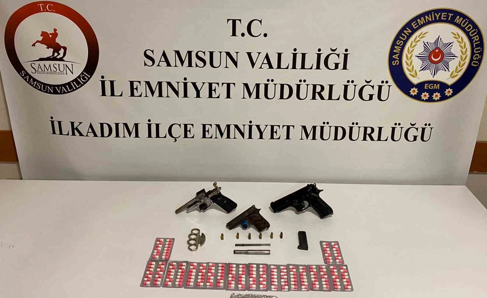 Edinilen bilgiye göre, Samsun Emniyet Müdürlüğü ekipleri İlkadım ilçesinde bir adrese operasyon düzenledi. Yapılan aramalarda; 2 adet ruhsatsız tabanca, 1 adet parçalı halde ruhsatsız tabanca, 5 adet fişek, 1 adet tabanca namlusu, 170 adet sentetik ecza, tek paket halinde 5 gram metamfetamin ve 1 adet muşta ele geçirildi. Olayla ilgili A.G. gözaltına alındı.