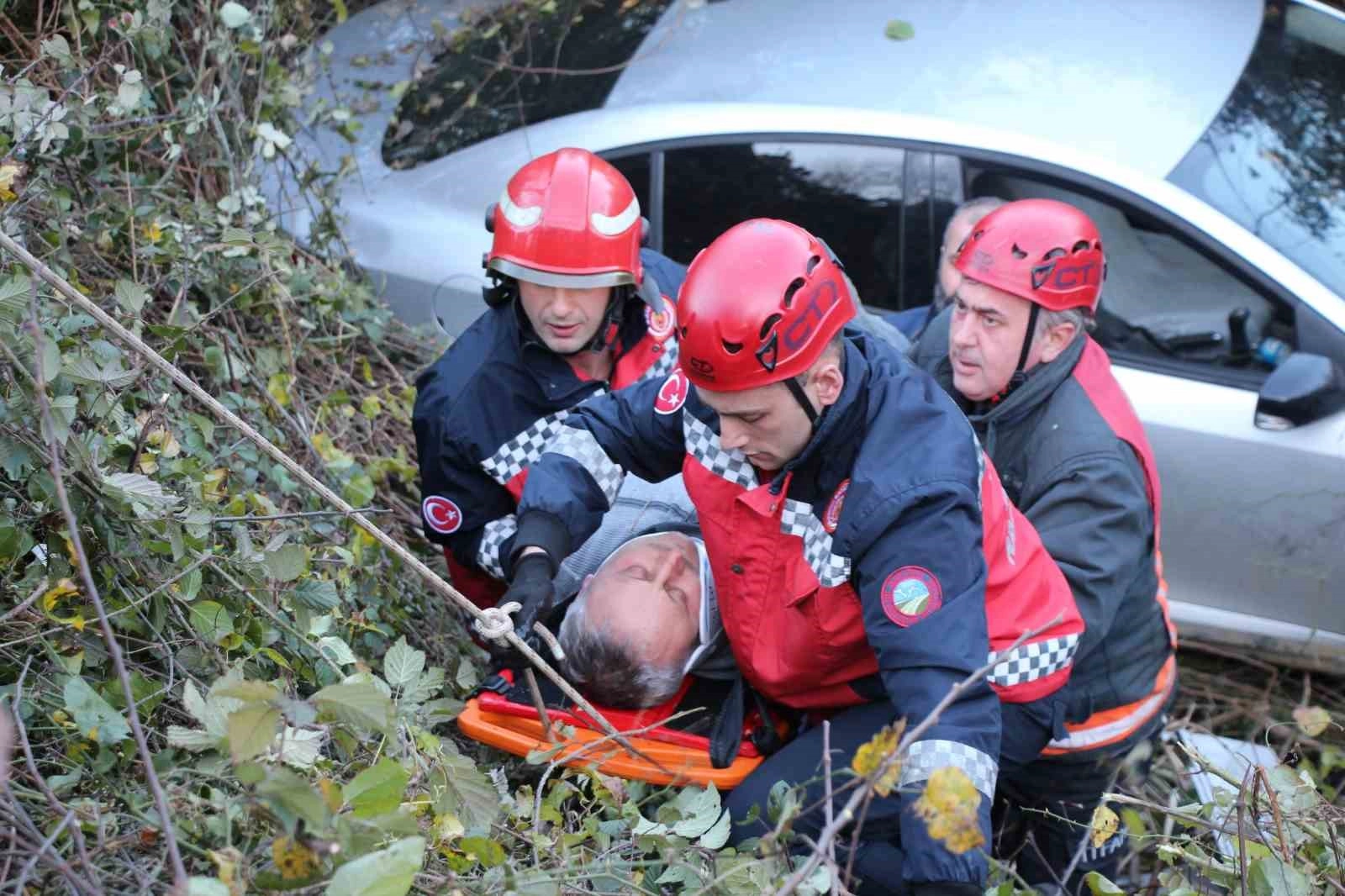 Sakarya'nın Akyazı ilçesinde şarampole uçan otomobilin sürücüsü itfaiye ekiplerince kurtarılarak sağlık ekiplerine teslim edildi.