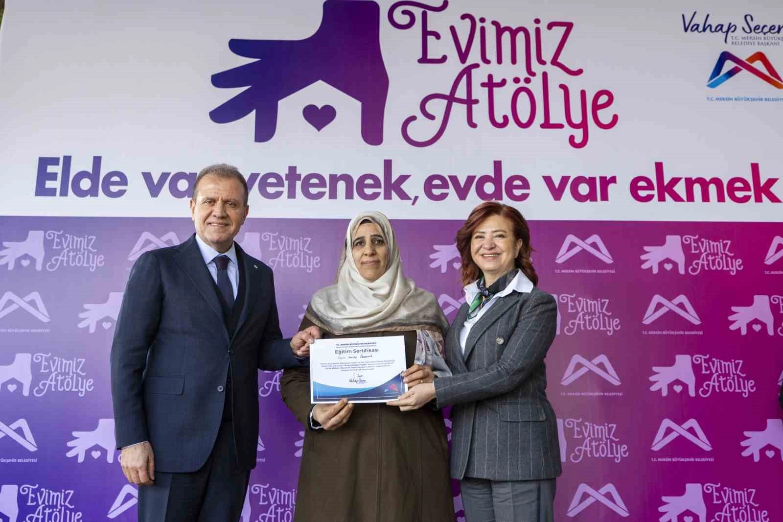 Başkan Seçer, Mersinden Kadın Kooperatifi Başkanı Meral Seçer ile birlikte 'Elde var yetenek, evde var ekmek' sloganıyla yürütülen, 'Evimiz Atölye' projesi kapsamında oyuncak yapım atölyesini tamamlayan kadınlarla sertifika töreninde bir araya geldi.