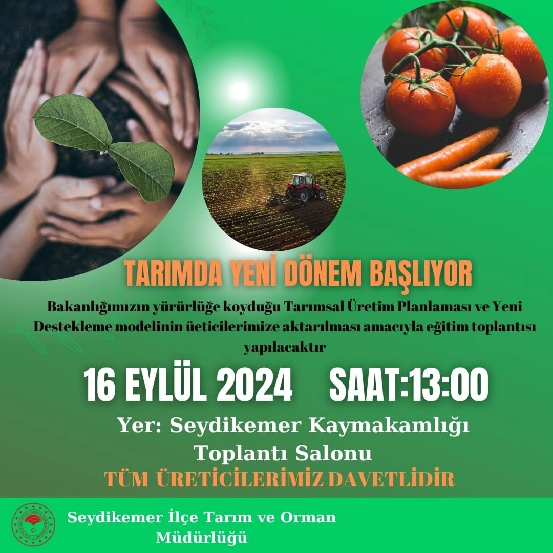 Tarım ve Orman Bakanlığı desteklemeleri ve üretim planlaması hakkında bilgilendirme toplantısı 16 Eylül 2024 tarihinde gerçekleşecek. Düzenlenecek olan eğitim Seydikemer Kaymakamlığı Toplantı Salonu'nda yapılacak.