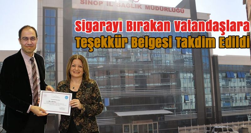 Sinop’ta Dünya Sigarayı Bırakma Günü etkinlikleri kapsamında Toplum Sağlığı Merkezi Sigara Bırakma Polikliniğinden destek alarak sigarayı bırakan vatandaşlara, sigarayı bırakıp sağlıklı bir hayata adım atıkları için Sağlık İl Müdür Dr. Mehmet Erşan tarafından Teşekkür Belgesi takdim edildi.
