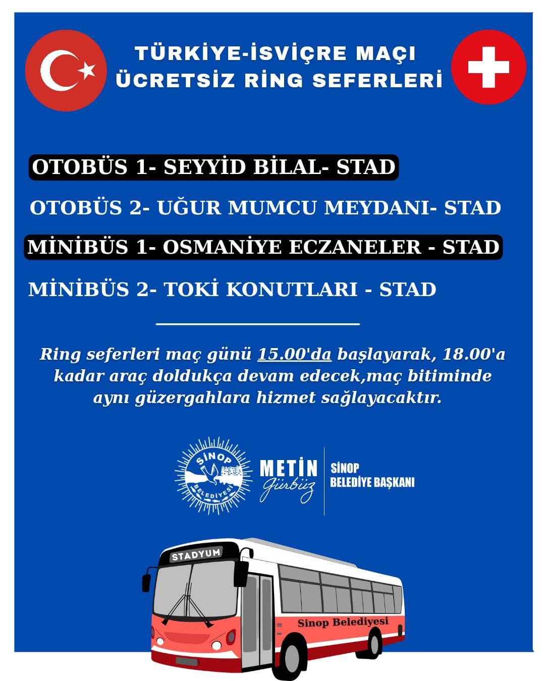Sinop Belediyesi tarafından yapılan açıklamaya göre, maç günü vatandaşların stadyuma rahat ve hızlı bir şekilde ulaşabilmesi için farklı noktalardan ring seferleri gerçekleştirilecek. Uygulama kapsamında 2 otobüs ve 2 minibüs hattı hizmet verecek.
