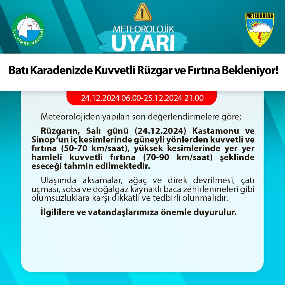 Meteoroloji 10. Bölge Müdürlüğü Bölge Tahmin ve Uyarı Merkezinden yapılan açıklamada, “Rüzgarın, Salı günü (24.12.2024) Kastamonu ve Sinop ‘un iç kesimlerinde güneyli yönlerden kuvvetli ve fırtına (50-70 km/saat), yüksek kesimlerinde yer yer hamleli kuvvetli fırtına (70-90 km/saat) şeklinde eseceği tahmin edilmektedir” denildi.