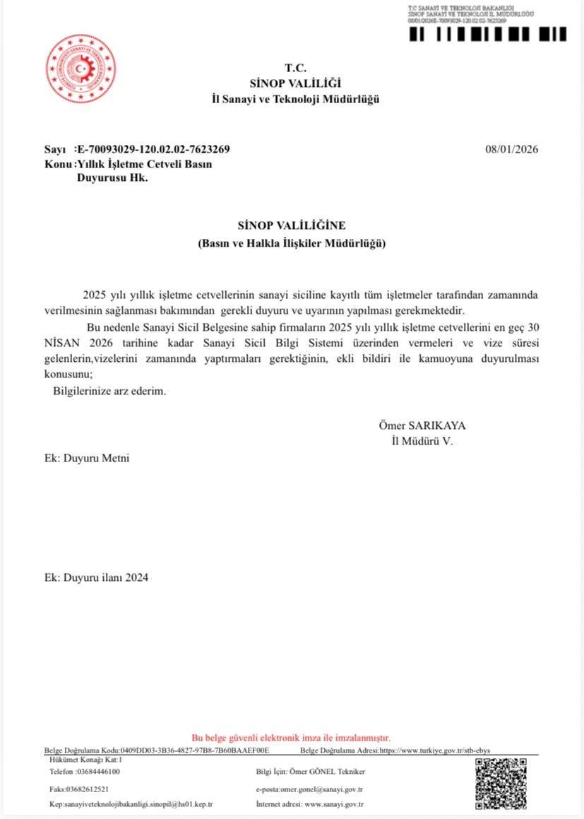 Müdür Vekili Ömer Sarıkaya imzasıyla yapılan açıklamada, Yıllık İşletme Cetvellerinin en geç 30 Nisan 2026 tarihine kadar Sanayi Sicil Bilgi Sistemi üzerinden gönderilmesi gerektiği belirtildi.