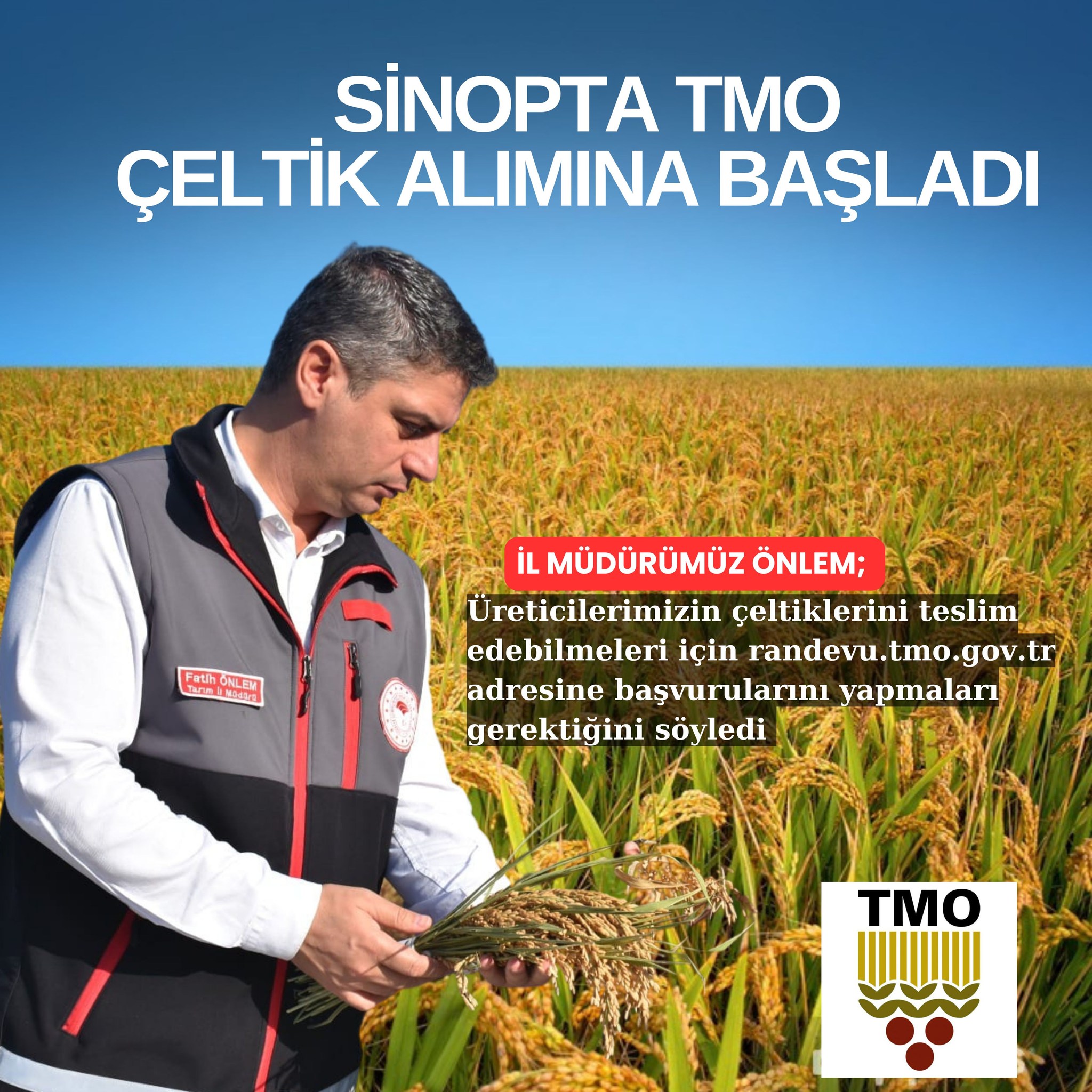 Tarım ve Orman İl Müdürü Fatih Önlem, üreticilerin çeltiklerini teslim edebilmek için internet üzerinden randevu almalarını gerektiğini belirterek,söz konusu çeltik alım merkezlerine çeltik teslim etmek isteyen üreticilerimiz internet üzerinden randevu.tmo.gov.tr. adresinden randevu alabilirler.Ayrıca; Üreticilerimizin Randevu alabilmesi için Çiftçi Kayıt Sistemine (ÇKS) bilgilerinin mutlaka güncel olması gerekmektedir” dedi.