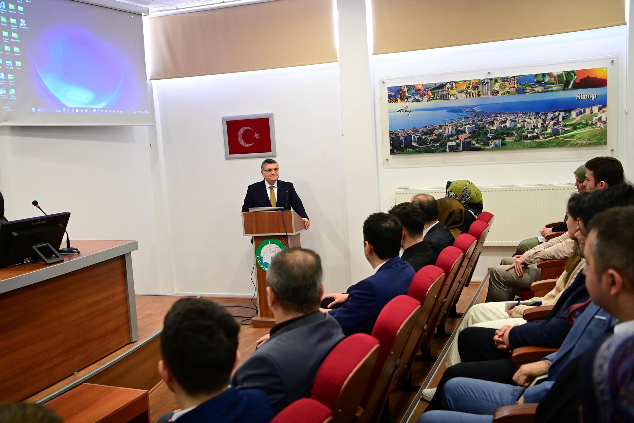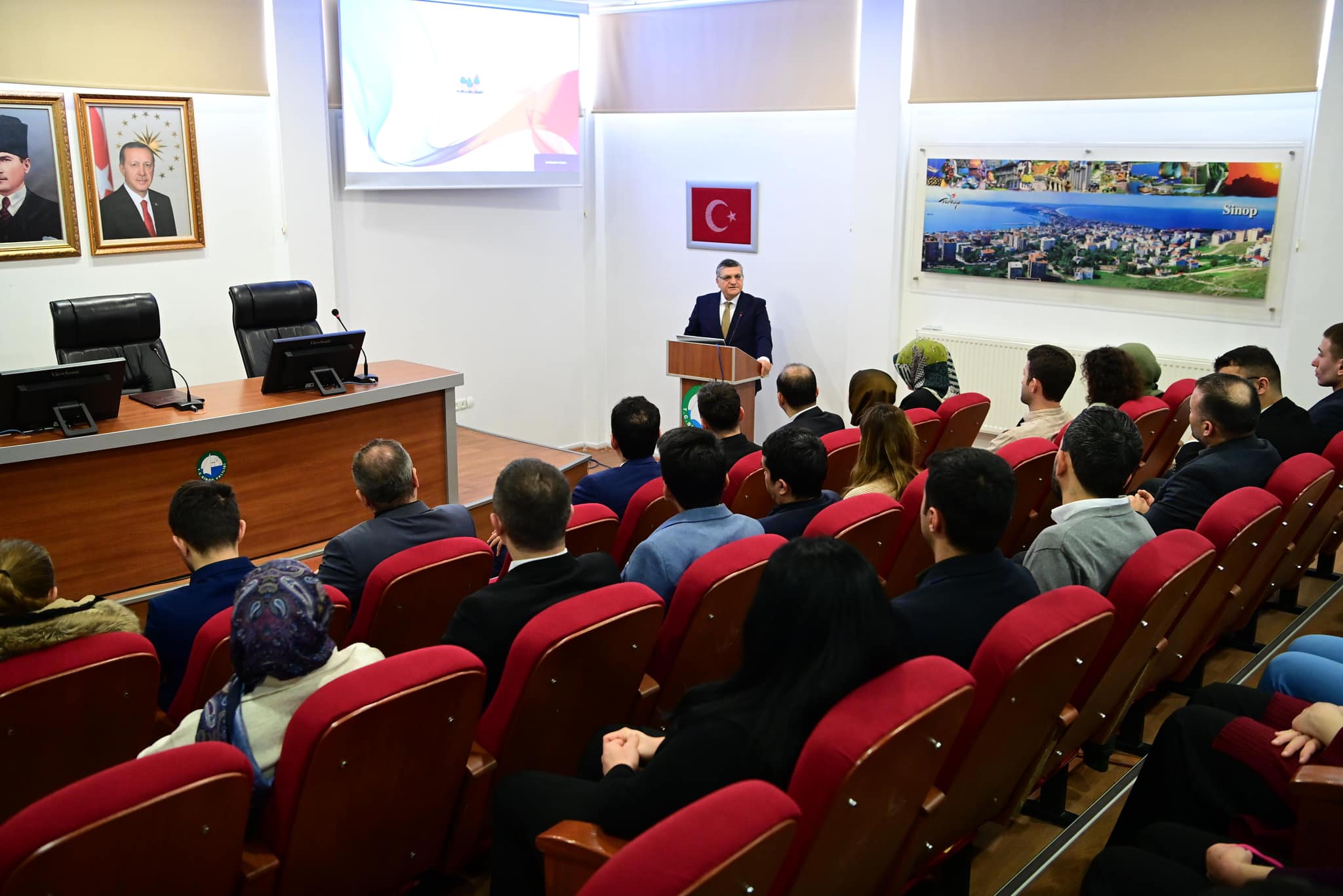 Sinop Valiliği Toplantı Salonunda düzenlenen eğitime, Sinop Valisi Dr. Mustafa Özarslan, Vali Yardımcısı Taner Bolat ve kamuda görev yapan personeller katıldı.