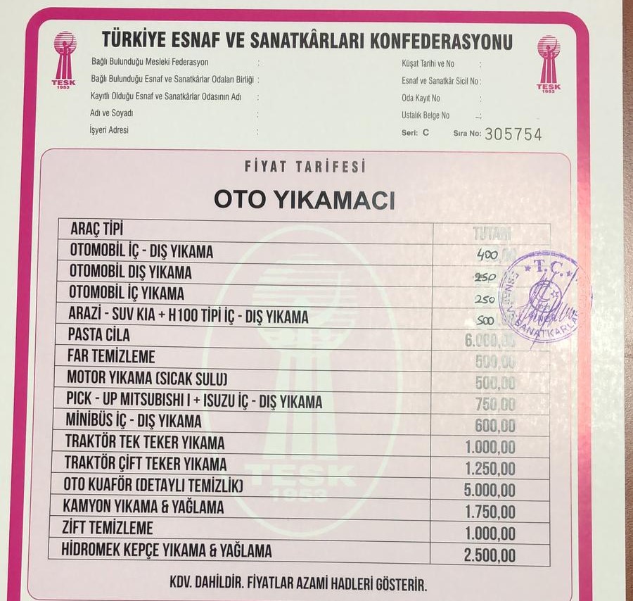 Artan maliyetler nedeniyle Sinop Esnaf ve Sanatkarlar Odasına başvuruda bulunan oto yıkama esnafının zam talepleri kabul edildi. Sinop Esnaf ve Sanatkarlar Odaları Başkanlığı Yönetim Kurulu kararıyla, il merkezindeki oto yıkama hizmetlerine zam yapıldı. Yeni tarifelere göre, otomobil iç-dış yıkama 400 TL, otomobil dış yıkama 250 TL, otomobil iç yıkama 250 TL, pasta cila 6000 TL, far temizleme 500 TL, sıcak sulu moto yıkama 500 TL, minibüs iç-dış yıkama ise 600 TL olarak belirlendi.