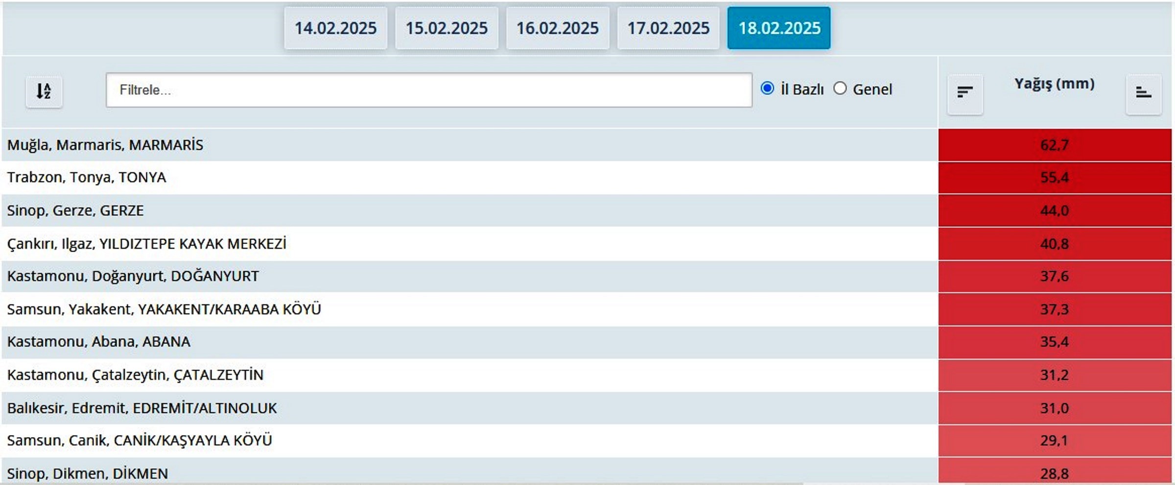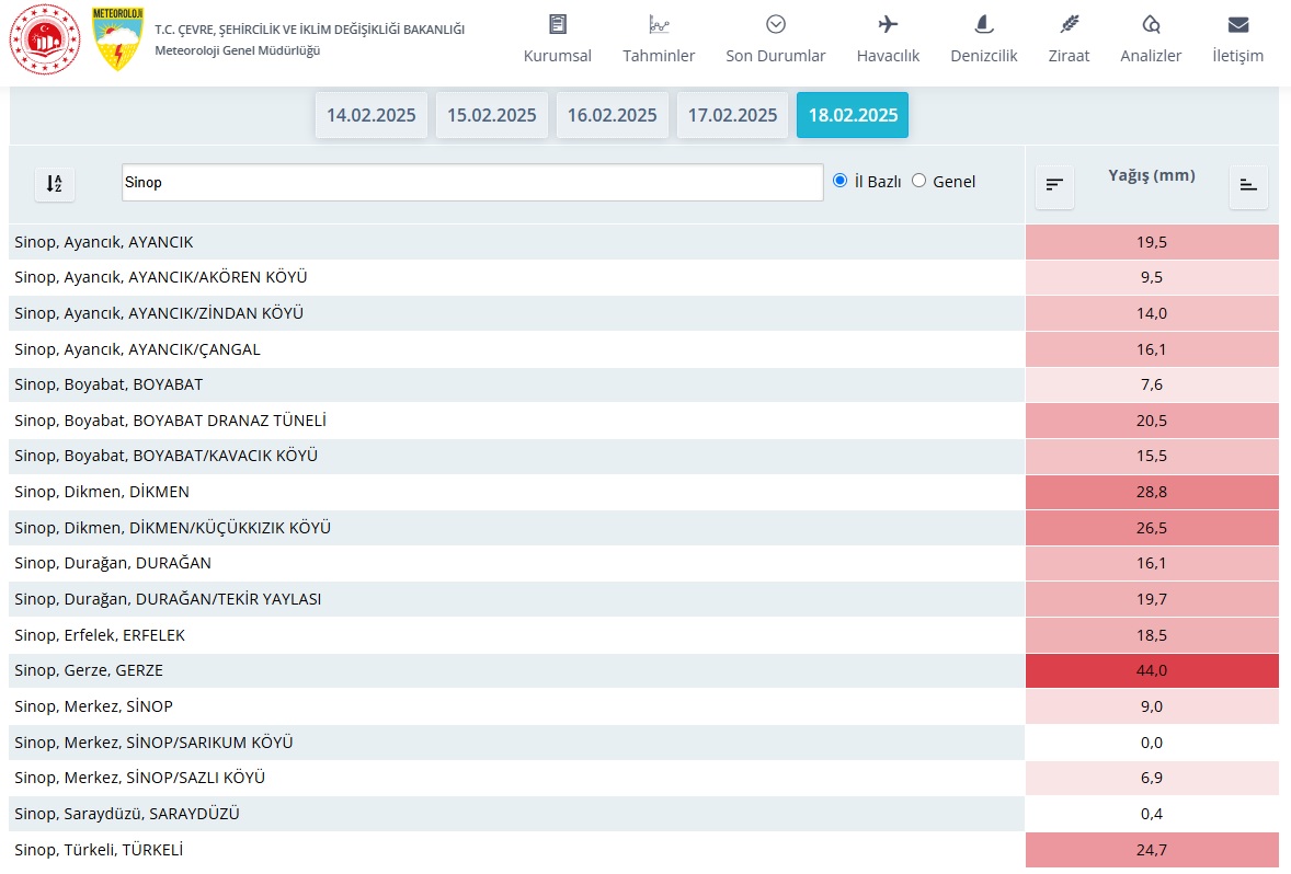 Son 24 saatte Gerze ilçesine 44 kilo yağış düştü. Böylece Sinop Muğla ve Trabzon'un ardından en çok yağış alan 3. il oldu. MGM yarın için Sinop bazı ilçeleri ve civar illere kar yağışıyla ilgili ‘sarı kod’ uyarısı verdi.