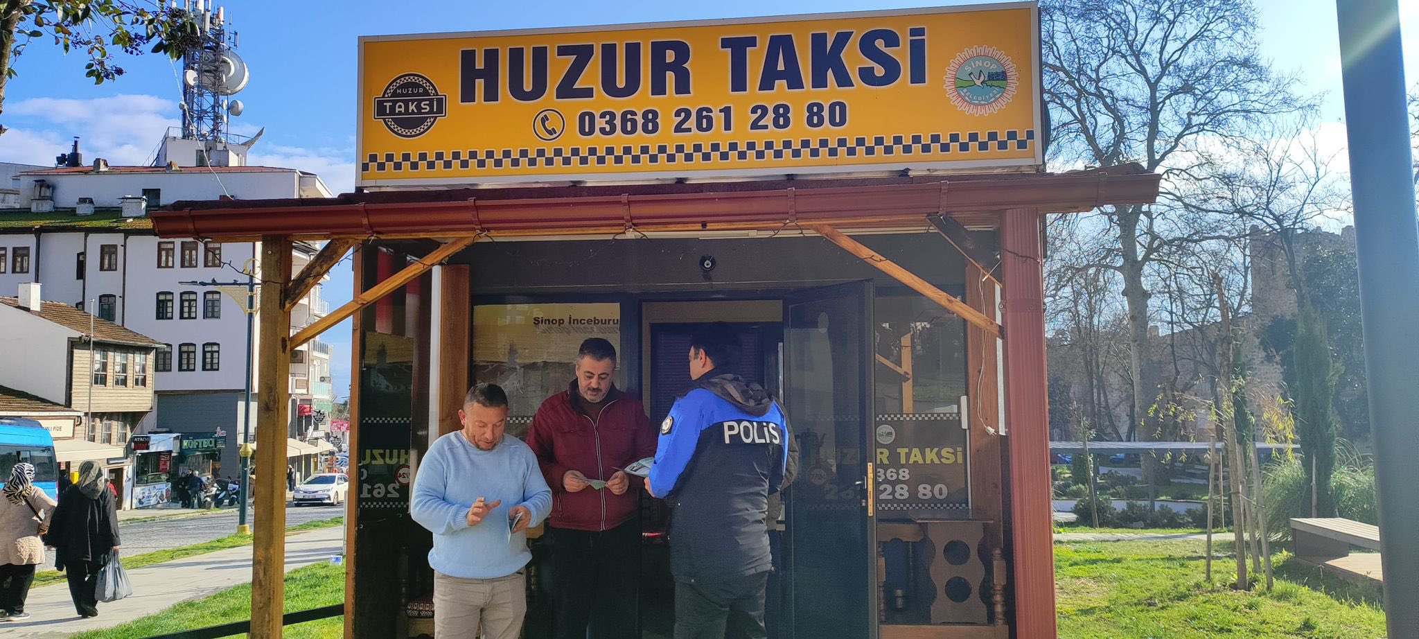 Sinop İl Emniyet Müdürlüğü Toplum Destekli Polislik Şube Müdürlüğü ekipleri taksi duraklarını ziyaret ederek, taksicilere İletişim Yoluyla Dolandırıcılık"* olaylarına karşı dikkatli olmaları konusunda bilgi verdi. Öte yandan taksicilere bilgilendirme ile ilgili broşür dağıtıldı.