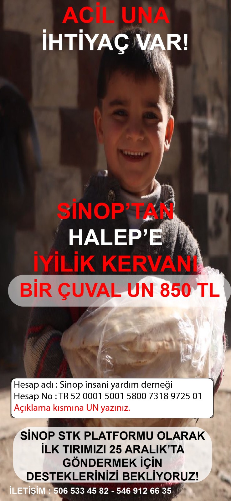 Sinop STK Platformu, Halep’teki zor durumdaki insanlara destek olabilmek amacıyla ilk etapta bir tır dolusu un göndermeyi planladığını duyurdu. Yardım tırı, 25 Aralık Çarşamba günü Sinop merkezden yola çıkacak.