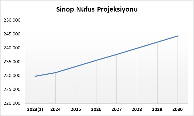 Demografik göstergelerdeki mevcut eğilimler devam ettiği takdirde, 2023 yılı ADNKS sonuçlarına göre 229 bin 716 kişi olan Sinop nüfusunun, 2030 yılında 244 bin 265 kişiye yükselmesi bekleniyor. 7 yıllık periyotta Sinop nüfusunun her yıl artacağı öngörülüyor.