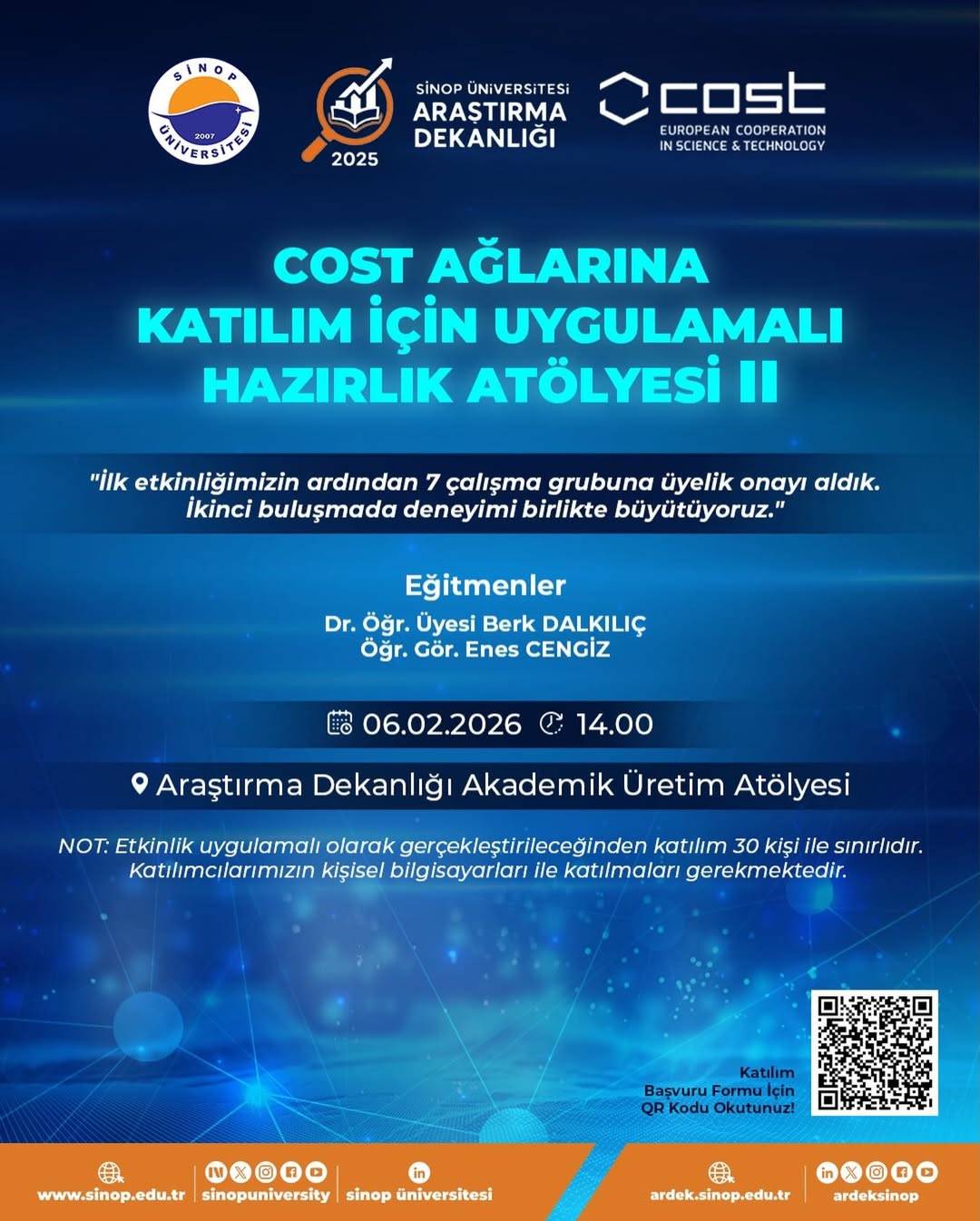 Etkinliğin eğitimcileri Dr. Öğr. Üyesi Berk Dalkılıç ve Öğr. Gör. Enes Cengiz olarak duyuruldu. Atölye kapsamında, ilk etkinlik sonrası yedi çalışma grubuna üyelik onayı alındığı belirtilirken, yeni buluşmada bu deneyimin daha da genişletileceği ifade edildi.