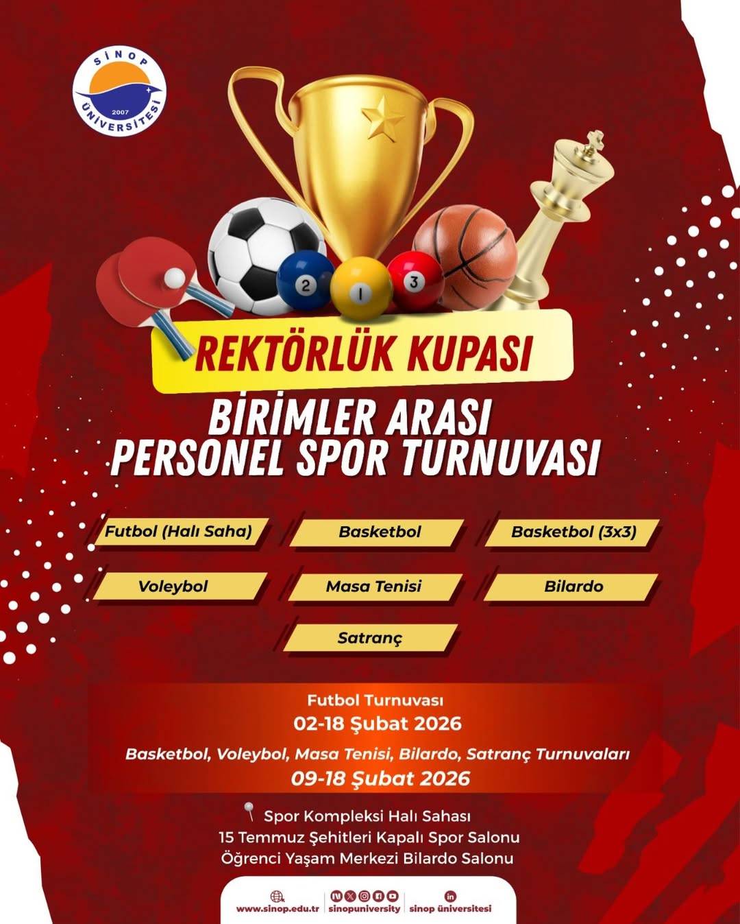 Müsabakaların Spor Kompleksi Halı Sahası, 15 Temmuz Şehitleri Kapalı Spor Salonu ve Öğrenci Yaşam Merkezi Bilardo Salonu’nda yapılacağı ifade edildi.