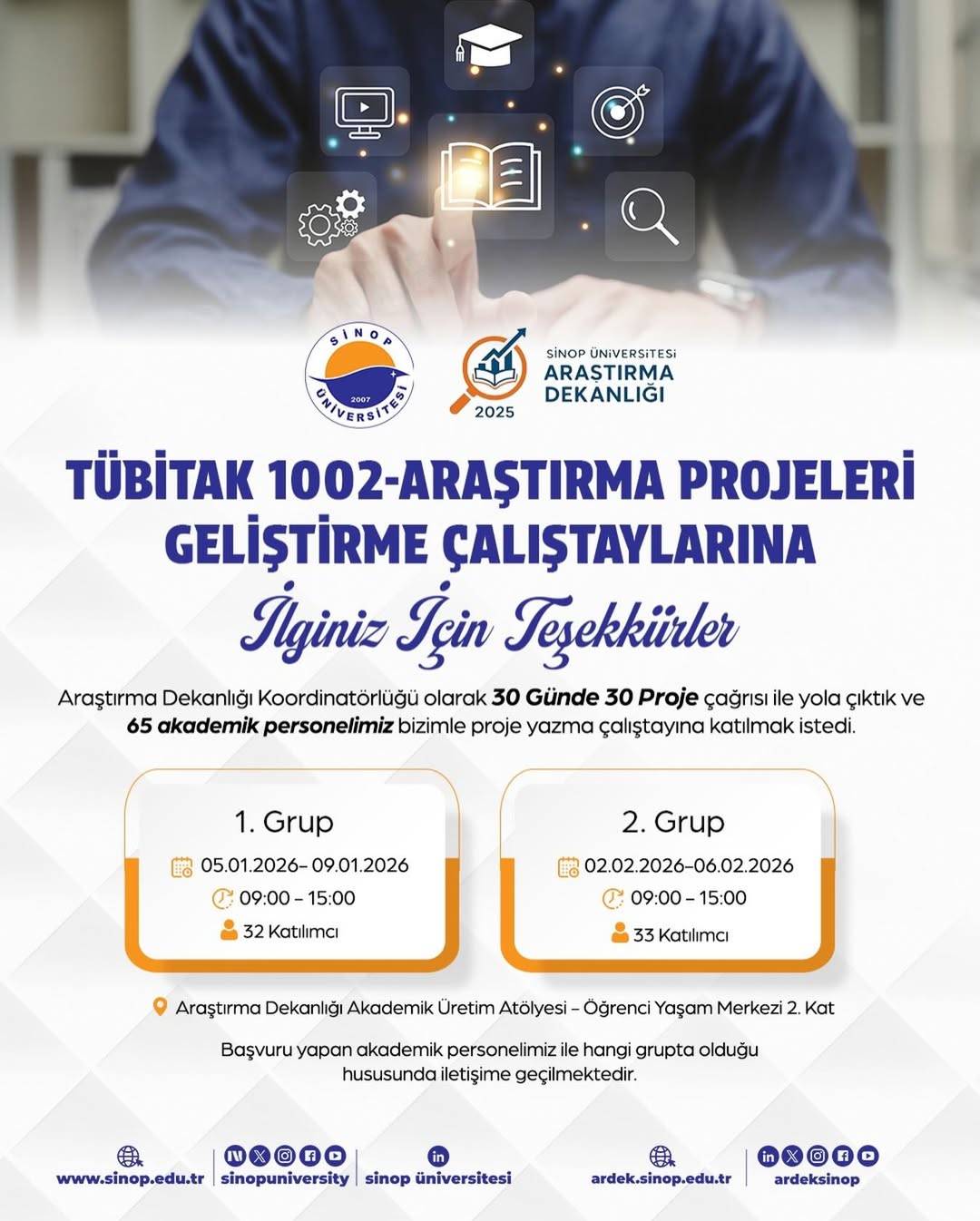 Çalıştaylar, Araştırma Dekanlığı Akademik Üretim Atölyesinde, Öğrenci Yaşam Merkezi 2. Kat’ta gerçekleştirilecek. Başvuru yapan akademik personelin hangi grupta yer aldığına ilişkin bilgilendirmenin ayrıca yapılacağı bildirildi.