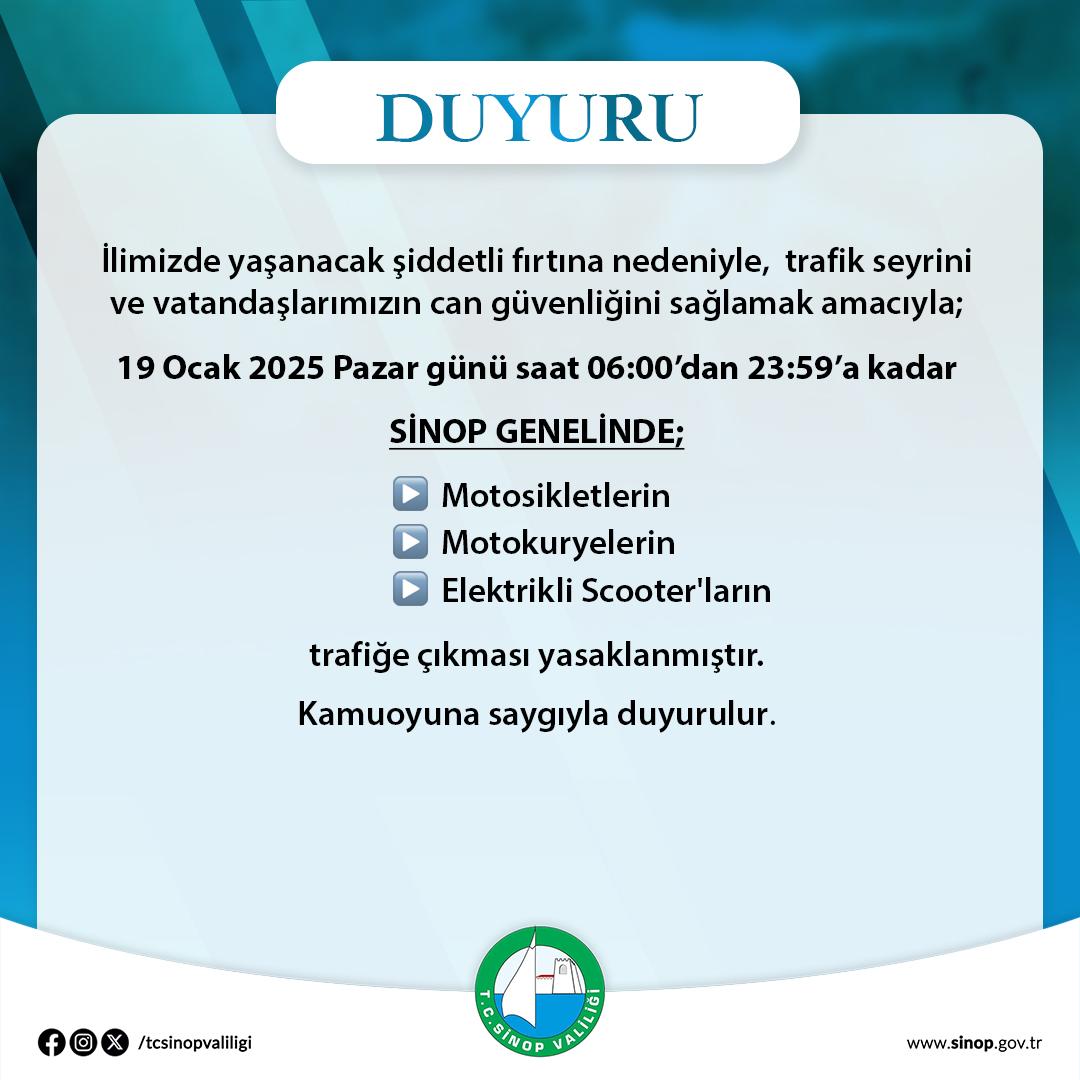 Sinop Valiliği tarafından İl genelinde yaşanan olumsuz hava koşulları ve şiddetli fırtına nedeniyle, trafik seyrini ve vatandaşların can güvenliğini sağlamak amacıyla 19 Ocak 2025 Pazar saat 06.00'dan 23.59'a kadar Sinop genelinde Motosikletlerin, Motokuryelerin ve Elektrikli Scooter'ların, tedbiren trafiğe çıkışının yasaklandığı bildirildi.