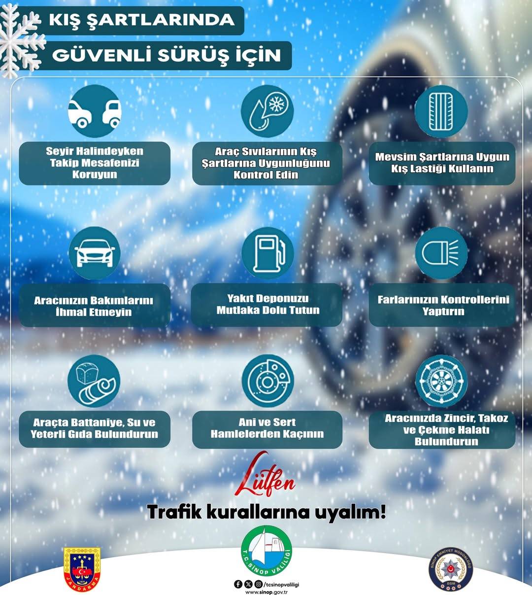 Açıklamada, seyir halindeyken takip mesafesinin mutlaka korunması gerektiği vurgulanırken, ani fren ve sert manevralardan kaçınılmasının hayati önem taşıdığı belirtildi. Ayrıca araç sıvılarının kış şartlarına uygunluğunun kontrol edilmesi, periyodik araç bakımlarının ihmal edilmemesi gerektiği ifade edildi.