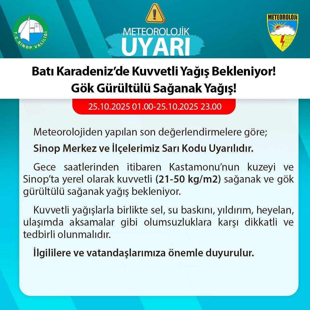 Sinop’un merkez ve tüm ilçeleri için geçerli olan sarı kodlu meteorolojik uyarı kapsamında, gerekli önlemlerin alınması gerektiği vurgulandı.