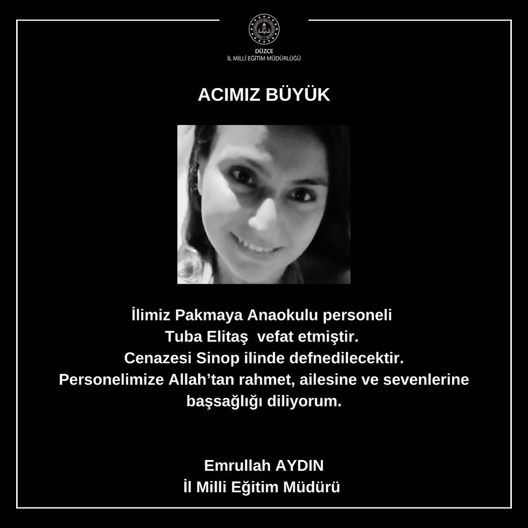 Kaza, Anadolu Otoyolu Bolu Dağı mevkiinde meydana geldi. Alınan bilgilere göre, Ankara’dan İstanbul istikametine giden Tuba Elitaş idaresindeki 48 BA… plakalı otomobil, aynı istikamette seyir halinde olan Semih Ş. idaresindeki 78 YD… plakalı kamyona arkadan çarptı. Otomobilin kamyona adeta ok gibi saplandığı kazada otomobil sürücüsü Tuba Elitaş olay yerinde hayatını kaybetti. Kaza sebebi ile İstanbul istikameti 2 şeritten sağlanırken, kaza bir başka aracın iç kamerasına an be an yansıdı. Öte yandan kazada hayatını kaybeden Tuba Elitaş’ın Sinop nüfusuna kayıtlı olduğu Düzce Pakmaya Anaokulu’nda hizmetli olarak çalıştığı ve cenazesinin Sinop’ta toprağa verileceği öğrenildi.