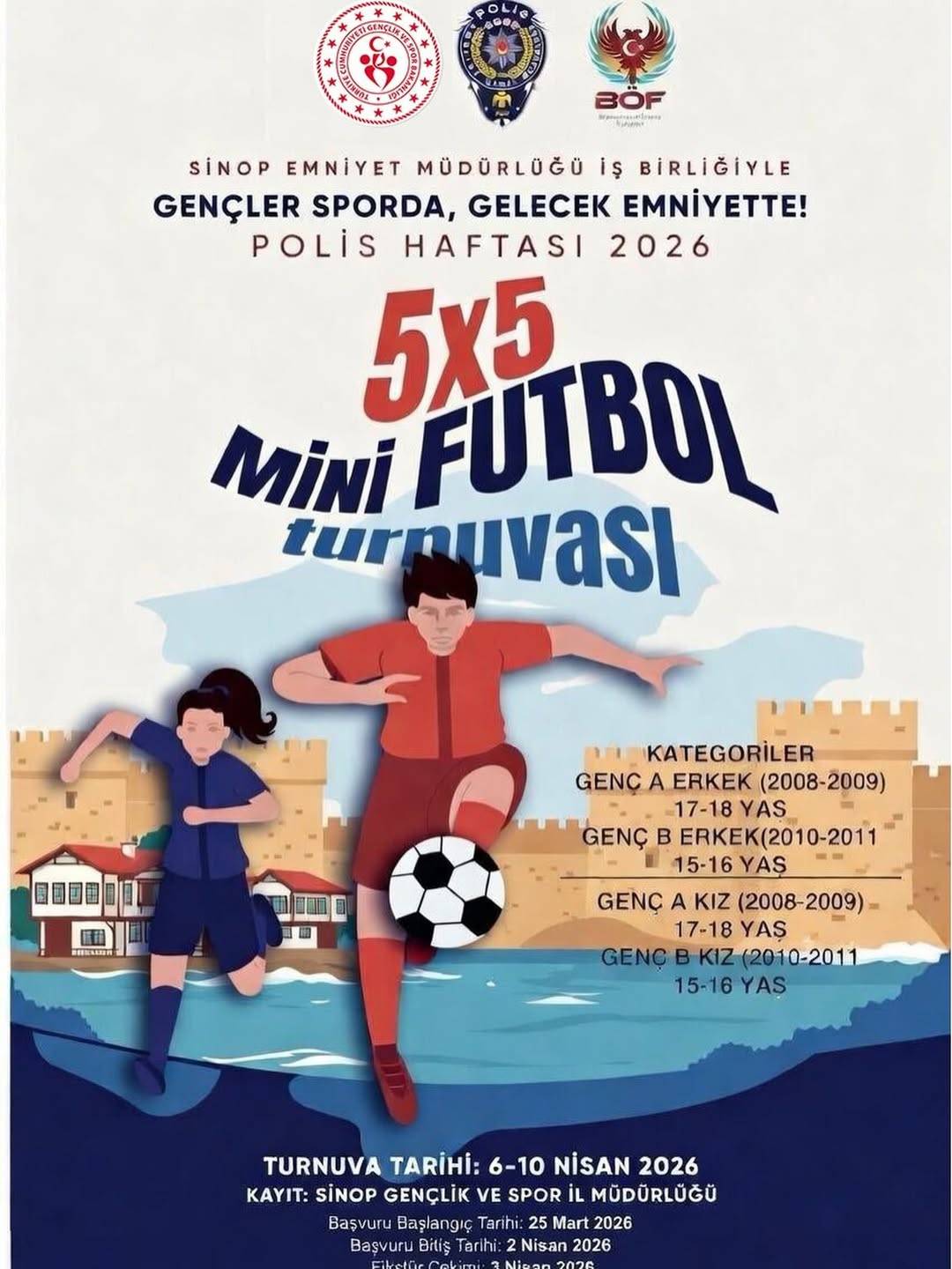 Turnuva 6–10 Nisan 2026 tarihleri arasında yapılacak. Katılım için başvurular, Sinop Gençlik ve Spor İl Müdürlüğü’nden alınacak. Başvuru dönemi 25 Mart’ta başlayacak ve 2 Nisan 2026 tarihinde sona erecek. Fikstür çekimi ise 3 Nisan 2026 tarihinde saat 16.00’da Sinop Gençlik ve Spor İl Müdürlüğü Toplantı Salonu’nun 3. katında gerçekleştirilecek.