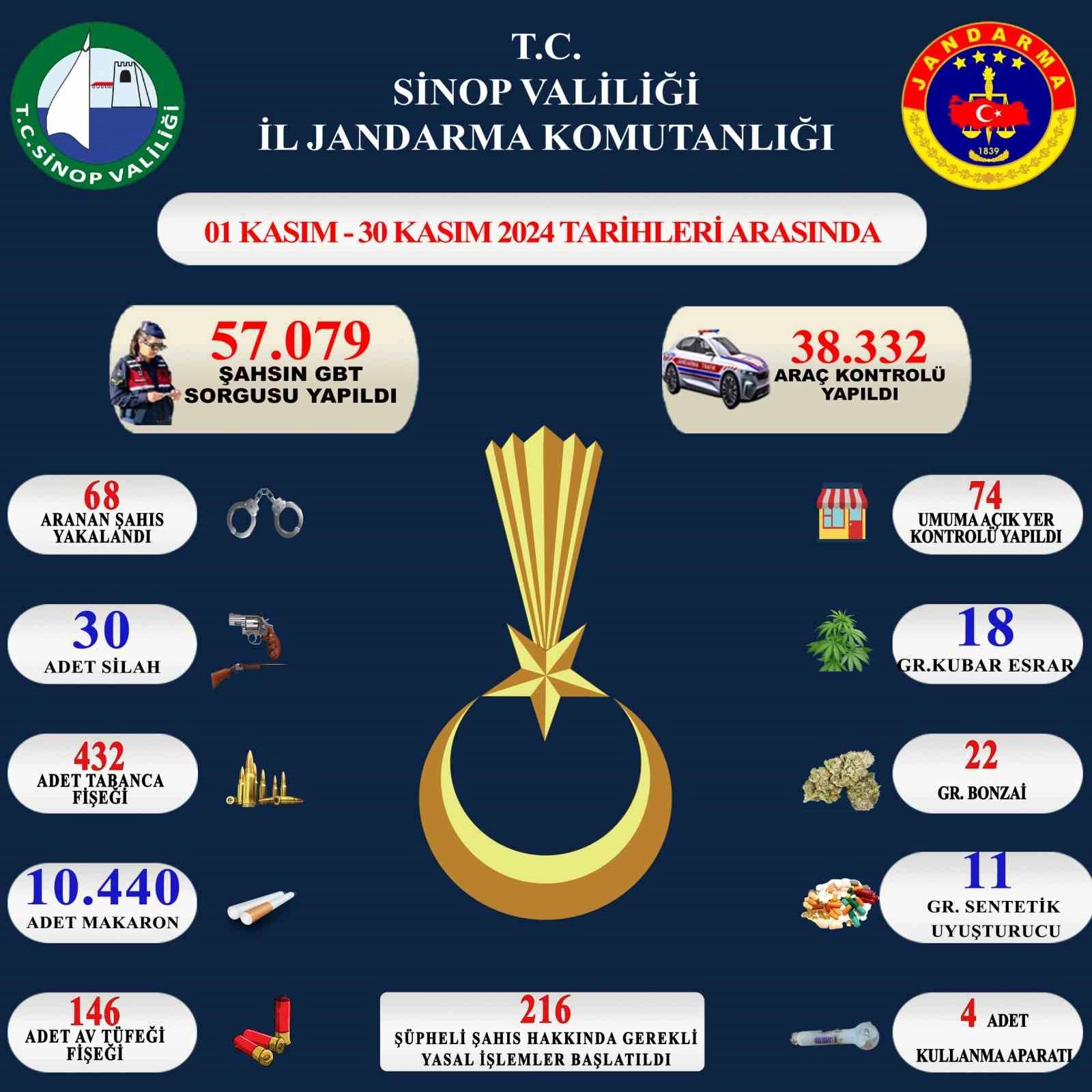 Sinop Valiliği tarafından paylaşılan raporda, İl Jandarma Komutanlığı tarafından 1 Kasım - 1 Aralık tarihleri arasında yapılan denetimlerde 57 bin 079 şahıs, 38 bin 332 araç sorgulandığı, çeşitli suçlardan 68 şahısın yakalandığı belirtildi. Öte yandan 30 adet silah ve 432 adet tabanca fişeği, 146 adet av tüfeği fişeği, 10 bin 440 adet makaron, 18 gram kubar esrar, 22 gram bonzai, 11 gram sentetik uyuşturucu, 4 adet kullanma aparatı ele geçirildi. 74 umuma açık yerin kontrolü yapılırken, 216 şüpheli şahıs hakkında gerekli yasal işlemler başlatıldı.