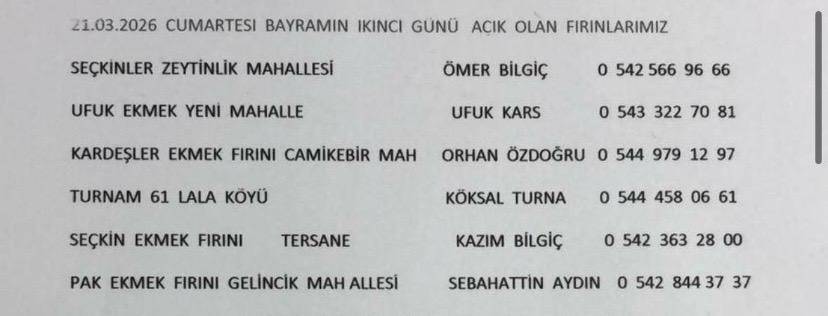 Yetkililer, vatandaşların ihtiyaçlarını karşılayabilmesi için belirlenen fırınların gün boyunca hizmet vereceğini belirterek, herhangi bir aksaklık yaşanmaması adına nöbetçi listesine uyulmasının önemine dikkat çekti.