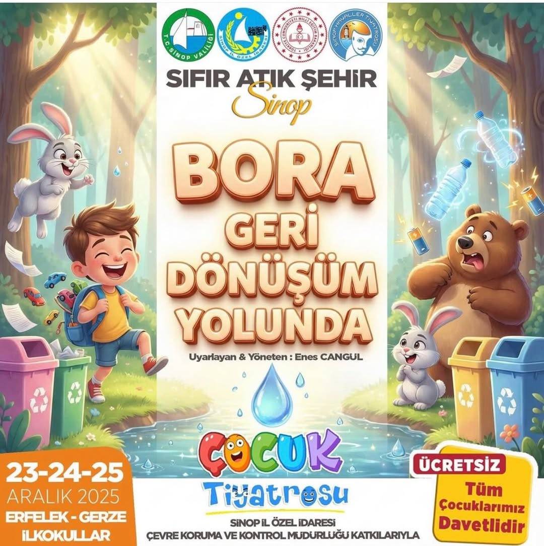 Sinop Valiliği himayelerinde, İl Özel İdaresi’nin koordinasyonunda ve İl Milli Eğitim Müdürlüğü paydaşlığında “Bora Geri Dönüşüm Yolunda” adlı çocuk tiyatrosu, 23-24-25 Aralık 2025 tarihlerinde Erfelek ve Gerze ilçelerinde öğrencilerle buluşacak.