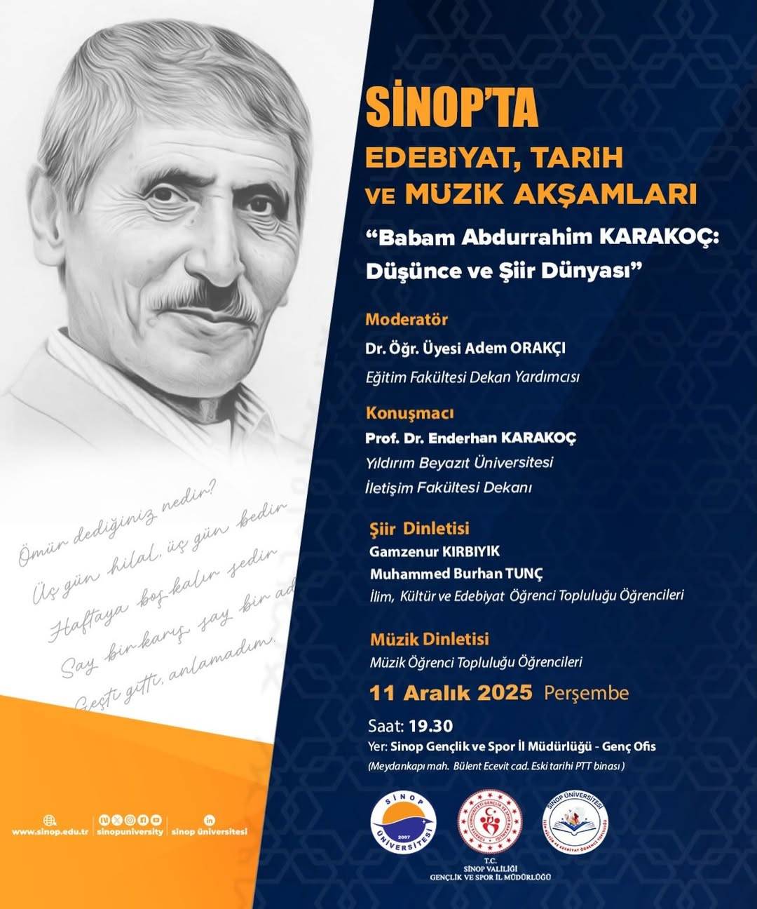 Gecede ayrıca İlim, Kültür ve Edebiyat Öğrenci Topluluğu öğrencileri Gamzenur Kırbıyık ve Muhammed Burhan Tunç tarafından şiir dinletisi gerçekleştirilecek. Müzik dinletisi ise Sinop Üniversitesi Müzik Öğrenci Topluluğu öğrencileri tarafından sunulacak.