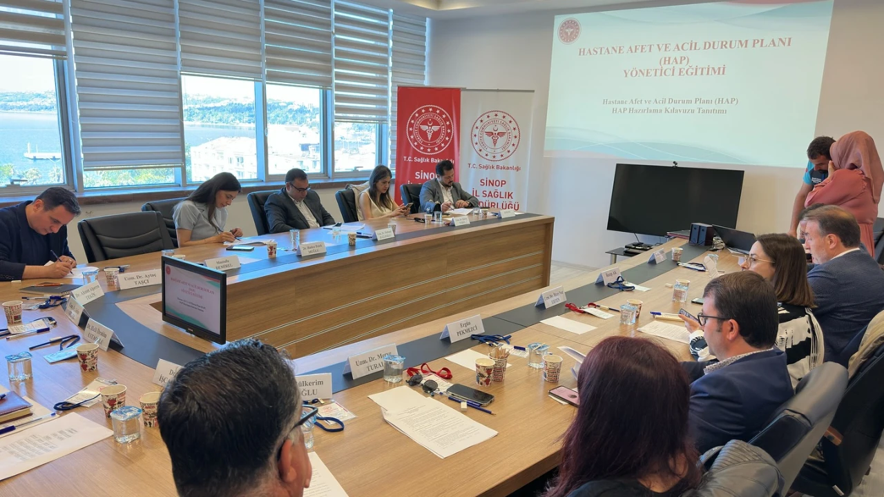 Sinop'ta Sağlık Hizmetleri Başkanı Dt. Halil İbrahim Ustaoğlu başkanlığında Hastane Afet ve Acil Durum Planı (HAP) Yönetici Eğitimi ve Toplantısı gerçekleştirildi.