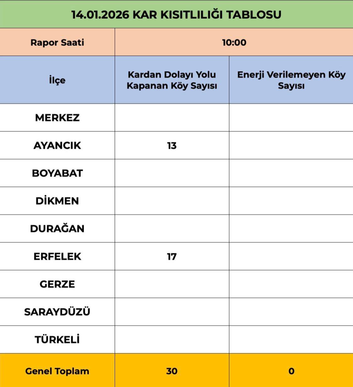 Sinop Valiliği koordinesinde yürütülen kış tedbirleri kapsamında Özel İdare ve Orman Bölge Müdürlüğü ekipleri çalışmalarını aralıksız sürdürüyor. 14 Ocak 2026 saat 10.00 itibarıyla hazırlanan “Kar Kısıtlılığı Tablosu”na göre, kardan dolayı yolu kapanan toplam köy sayısı 30 olarak kaydedildi. Ayancık ilçesinde 13, Erfelek ilçesinde ise 17 köy yolunun kapalı olduğu bildirildi. Enerji nakil hatlarında ise herhangi bir kesinti yaşanmazken, enerji verilemeyen köy bulunmadı. Yetkililer, kapanan yolların yeniden ulaşıma açılması için sahada yoğun şekilde çalışmaların devam ettiğini belirtti.