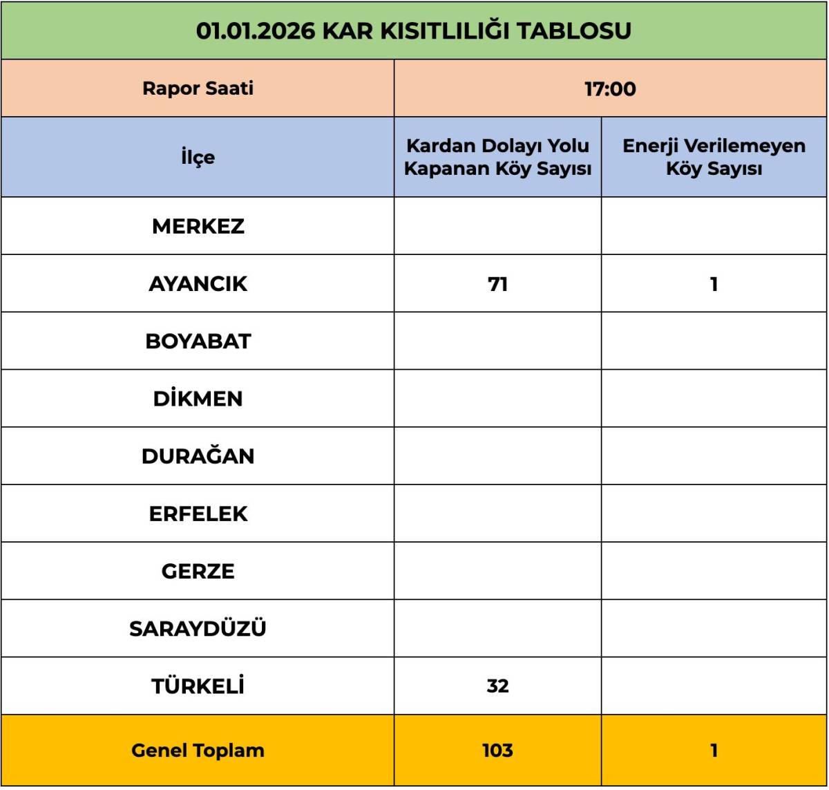 01 Ocak 2026 günü saat 17.00 itibarıyla hazırlanan Kar Kısıtlılığı Tablosuna göre, il genelinde kardan dolayı 103 köy yolunun ulaşıma kapalı olduğu bildirildi. En fazla yol kapanmasının Ayancık ilçesinde 71 köy, Türkeli ilçesinde ise 32 köy ile yaşandığı kaydedildi.