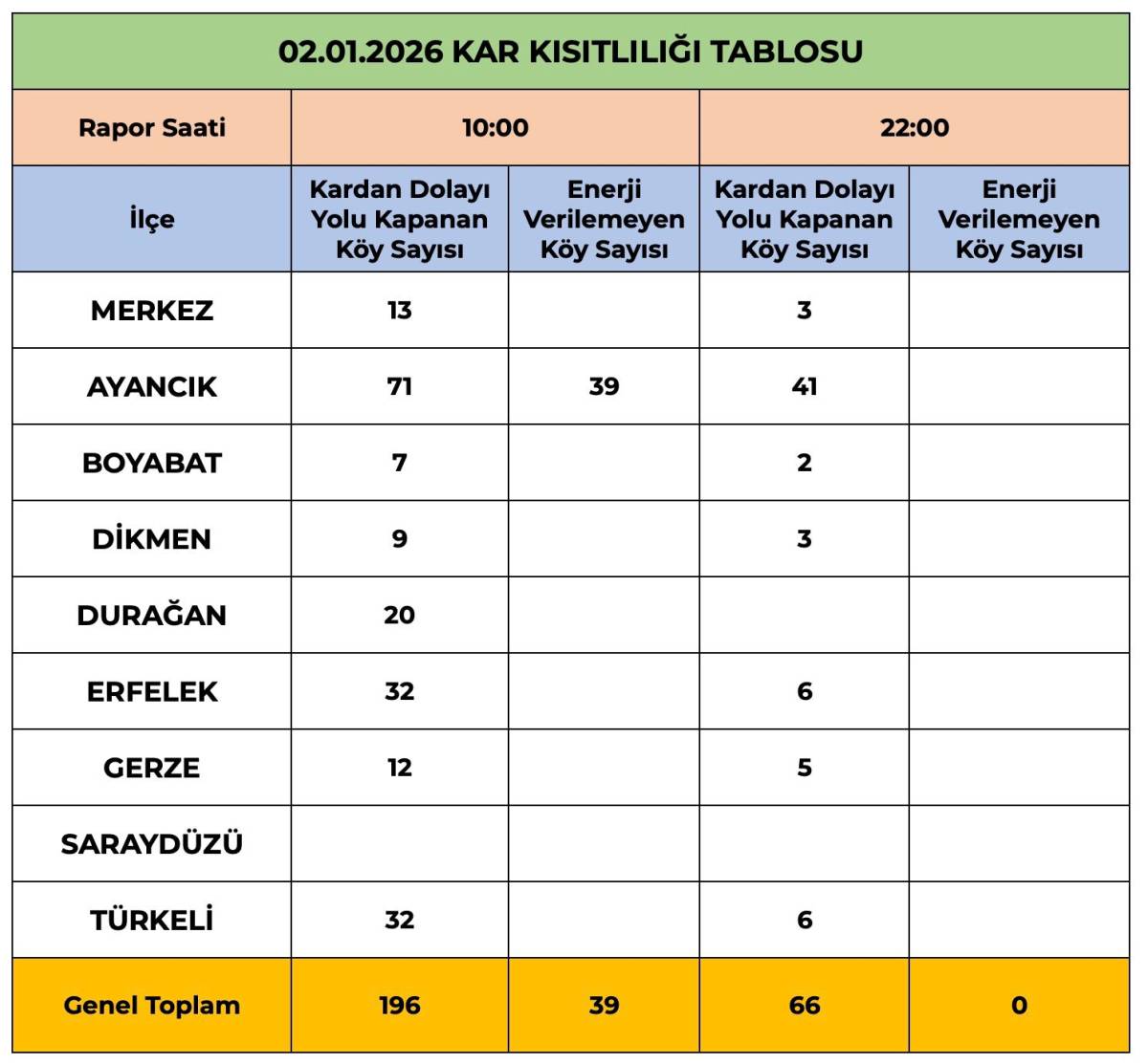 02.01.2026 tarihli kar kısıtlılığı tablosuna göre sabah saat 10.00 itibarıyla il genelinde 196 köy yolunun kar nedeniyle kapalı olduğu, 39 köye ise enerji verilemediği bildirildi. Gün içerisinde ekiplerin yoğun çalışmaları sonucunda saat 22.00 itibarıyla kar nedeniyle kapalı köy yolu sayısının 66’ya düşürüldüğü, enerji verilemeyen köy bulunmadığı belirtildi.