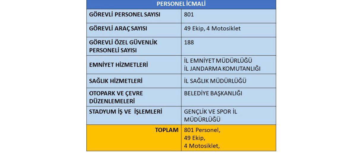 Organizasyonun huzur içerisinde geçmesi için tüm birimlerin sahada olacağını belirten Vali Özarslan, “49 ekip, motosikletli timler ve 188 özel güvenlik personeli olmak üzere toplamda 801 personel müsabakada görevli olacak. Asayiş ve güvenlik hizmetleri emniyet ve jandarmamız tarafından yürütülecek. Sağlık hizmetleri İl Sağlık Müdürlüğümüzce sağlanacak” dedi.