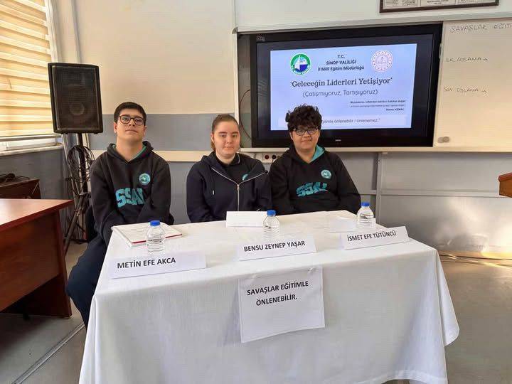 Program kapsamında Sarı Saltuk Anadolu Lisesi 10. sınıf öğrencilerinden oluşturulan münazara takımları, kendi yaşıtlarından oluşan 25 kişilik jüri önünde düşüncelerini savundu. Öğrenciler, “Savaşlar eğitimle engellenebilir” ve “Savaşlar eğitimle engellenemez” başlıkları altında argümanlarını ortaya koyarak fikirlerini ifade etti.