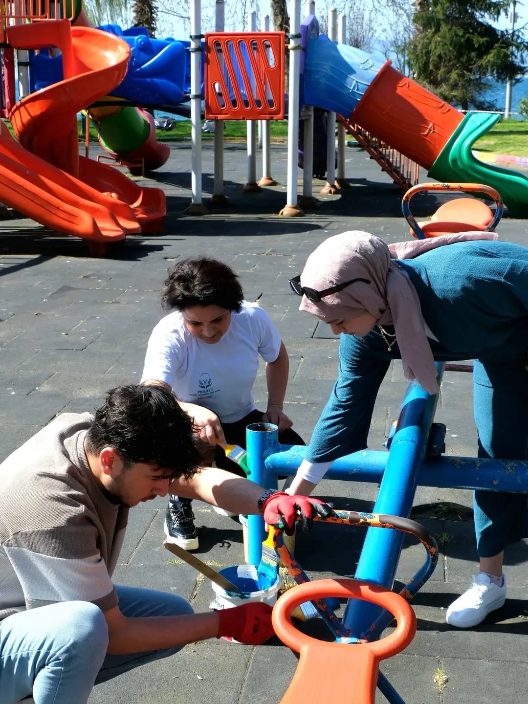 Etkinlikte öğrenciler, park alanındaki oyun gruplarını boyayarak hem çevre düzenlemesine katkı sağladı hem de çocuklar için daha renkli ve güvenli bir oyun alanı oluşturulmasına destek verdi.