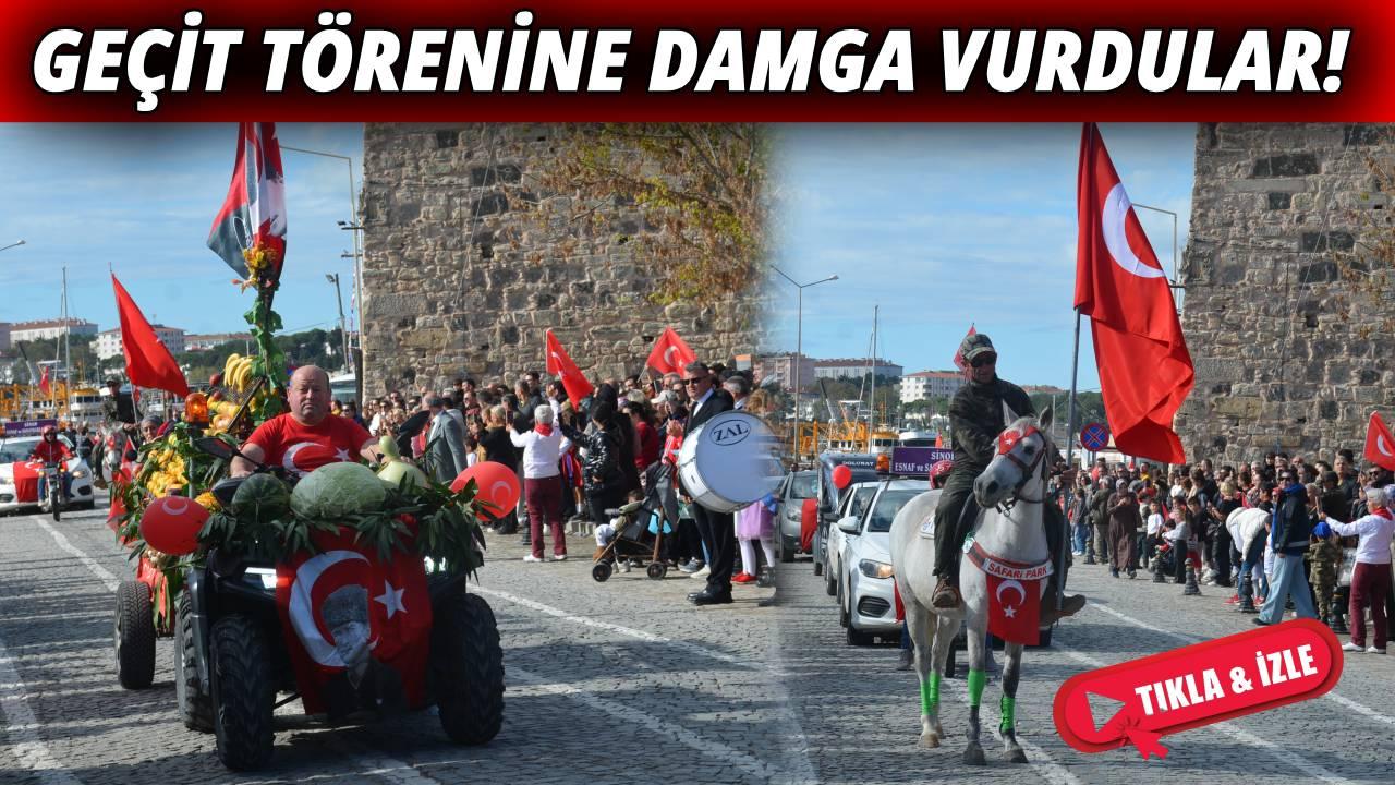 Kutlamalarda en dikkat çeken anlardan biri ise Sinoplu manav Gökhan Canel ve Mustafa Apaydın isimli vatandaşın geçişi oldu. Cumhuriyet Bayramı’na özel olarak hazırladığı motosikletini sebze ve meyvelerle süsleyen Canel, kortejde renkli görüntüler oluşturdu. Kabaktan karpuza, mandalinadan üzüme kadar birçok ürünle süslenen motosiklet, vatandaşların yoğun ilgisini topladı.Mustafa Apaydın ise atıyla geçit törenine katılarak büyük alkış topladı.