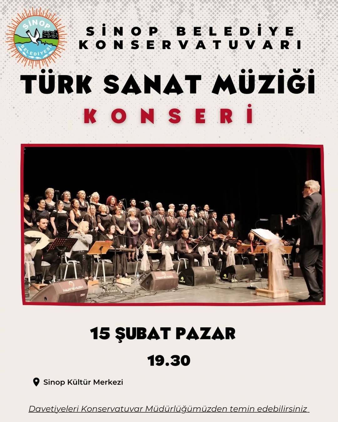 Sinop Belediye Konservatuvarı tarafından düzenlenen Türk Sanat Müziği Konseri, 15 Şubat Pazar günü sanatseverlerle buluşacak.