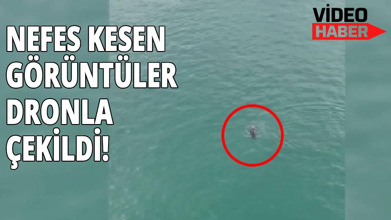 Dron kamerasına yansıyan görüntülerde yunusların su yüzeyinde senkronize şekilde yüzdüğü anlar dikkat çekti.