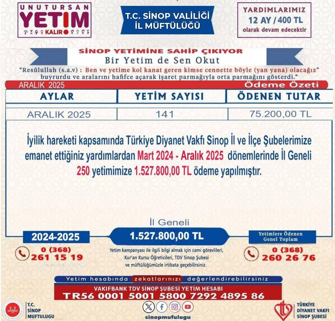 Sinop İl Müftülüğü tarafından yapılan açıklamada, yetimlere destek olan tüm hayırseverlere ve sürece katkı sunan din görevlilerine teşekkür edilerek, kampanyanın artarak devam edeceği vurgulandı.