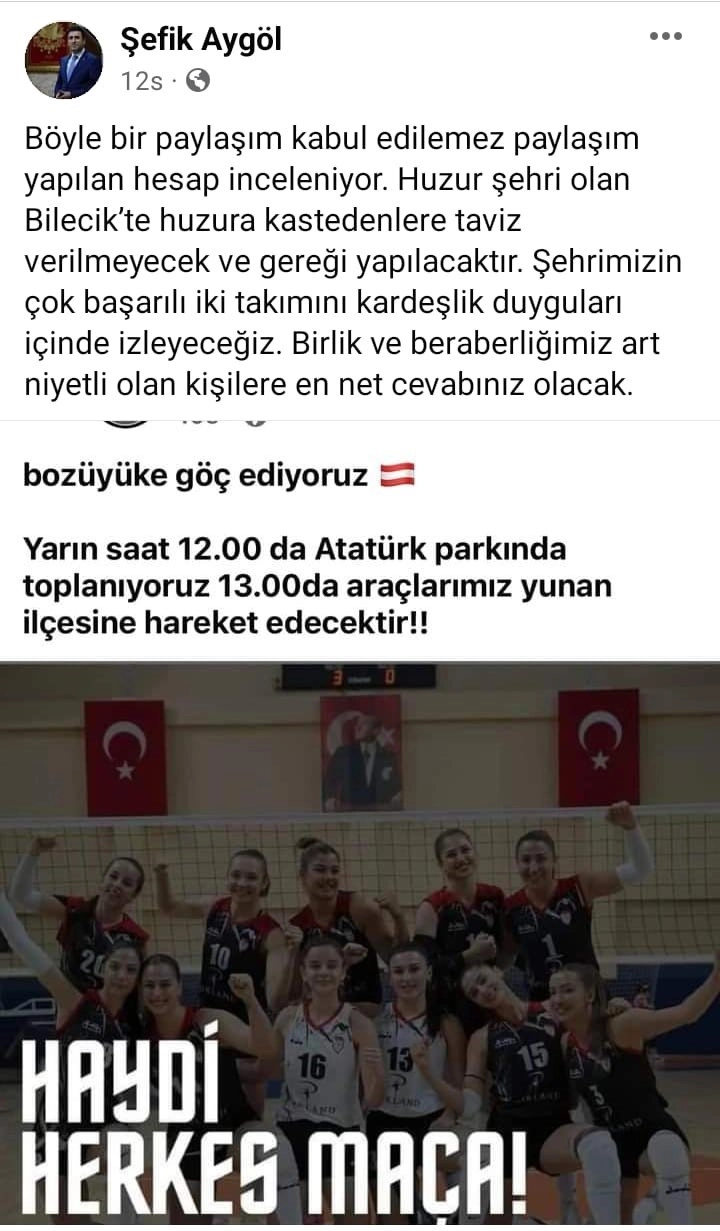 Bugün Bilecik'in Bozüyük ilçesinde Bozüyük Belediyespor Voleybol takımı ile Bilecik Belediyespor Voleybol takımının karşılaşacağı maç öncesi taraftar grubundan skandal paylaşım yapıldı. Yaptıkları paylaşımda "Bozüyük'e göç ediyoruz. Atatürk parkında toplanıyoruz 13.00'de araçlarla Yunan ilçesine hareket edecektir" denildi. Bu paylaşımı gören sporseverler tepki gösterdi.