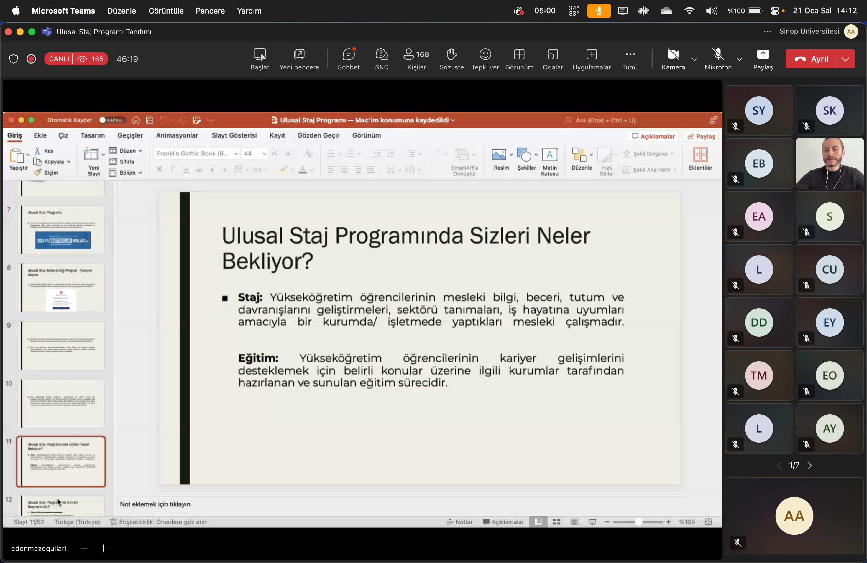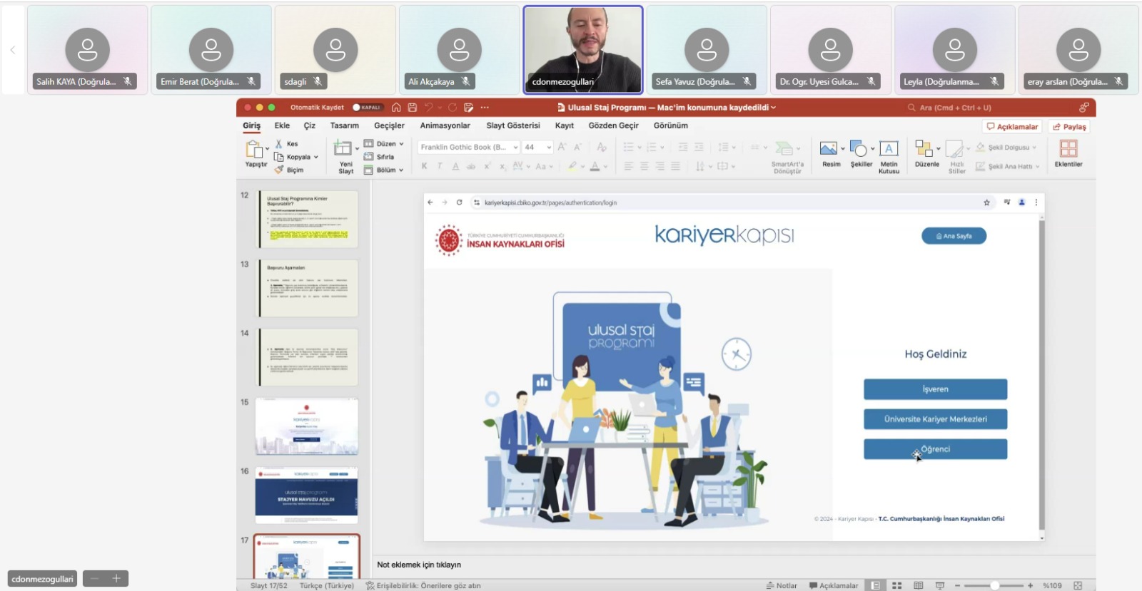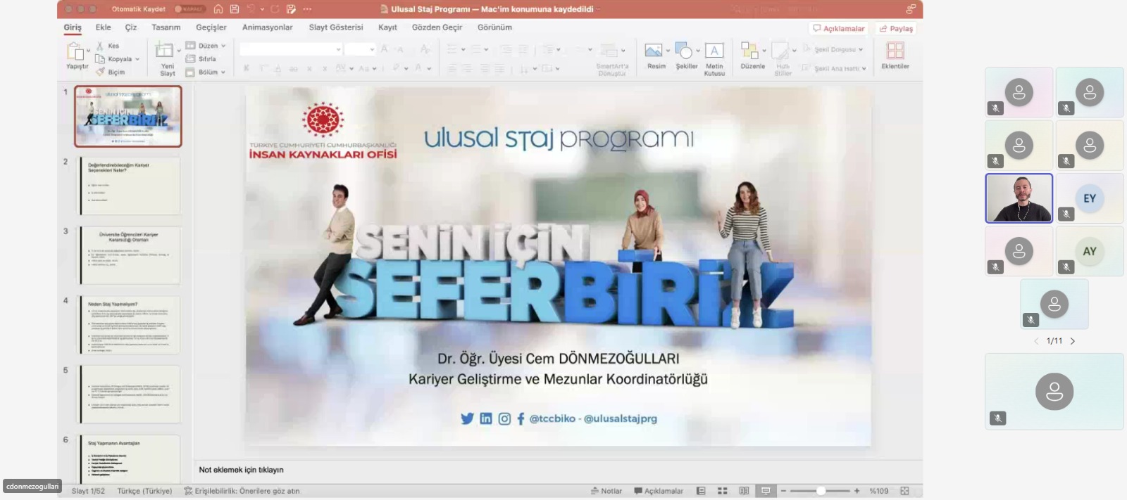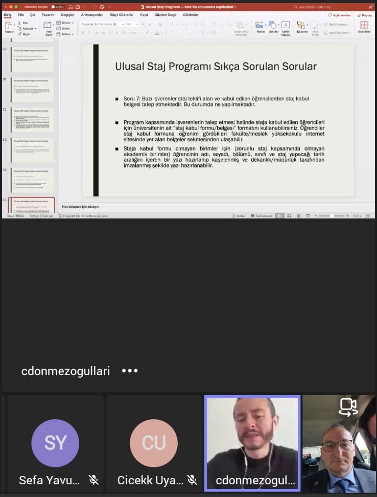 Çevrim içi olarak gerçekleştirilen tanıtım programında, Kariyer Geliştirme ve Mezunlar Koordinatörlüğü Koordinatörü Dr. Öğr. Üyesi Cem Dönmezoğulları öğrencilere programın detayları hakkında bilgi verdi. Dr. Dönmezoğulları, Ulusal Staj Programı’nın öğrencilere sunduğu fırsatlar, başvuru süreci, staj deneyiminin kariyer gelişimine katkıları ve programın sağladığı avantajlar üzerinde durdu.