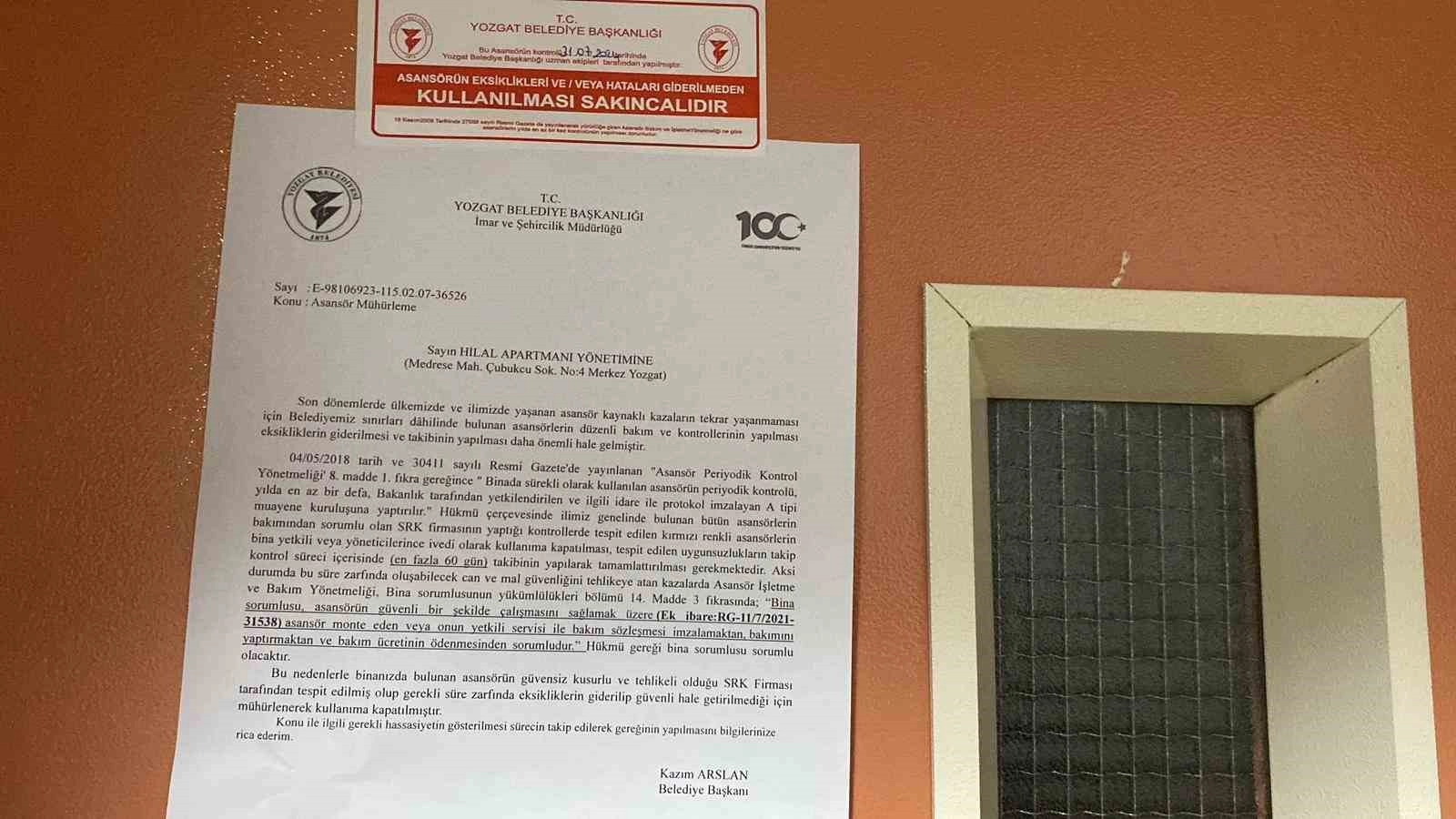 Yozgat Belediyesi, şehir merkezinde asansör denetimlerine yoğun bir şekilde devam ediyor. Güvenli olmadığı tespit edilen asansörlere kırmızı etiket vuruluyor ya da asansörler kapatılıyor. Kent genelinde son bir ayda 300'e yakın asansöre kırmızı etiket vuruldu.